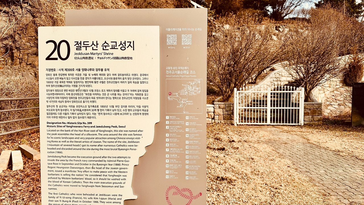 양화대교 남단에 이르면 머리에 삿갓을 쓴 듯한 교회 하나가 언덕 위에 우뚝 서 있는 모습을 볼 수가 있다. 천주교회의 ‘절두산 순교 성지’이다.