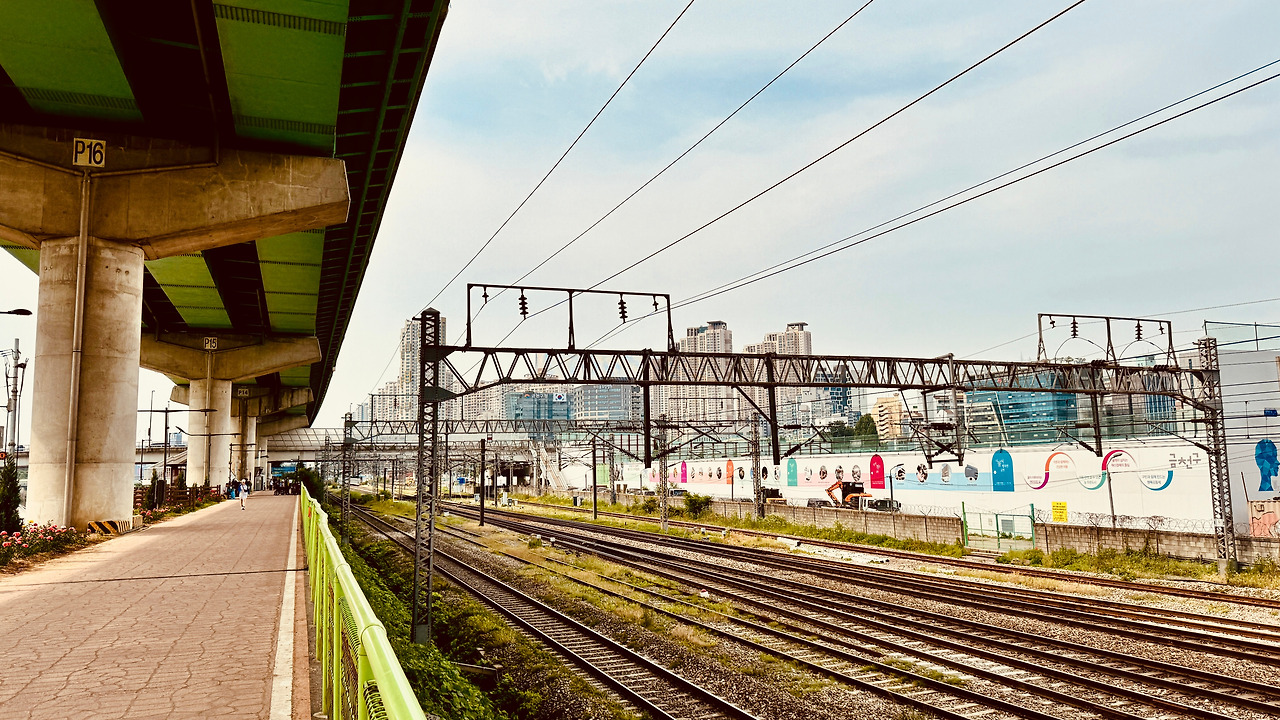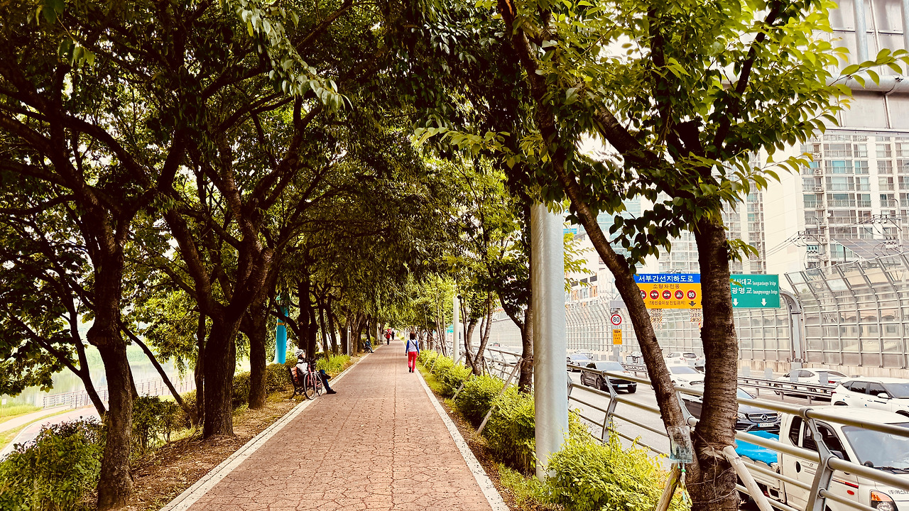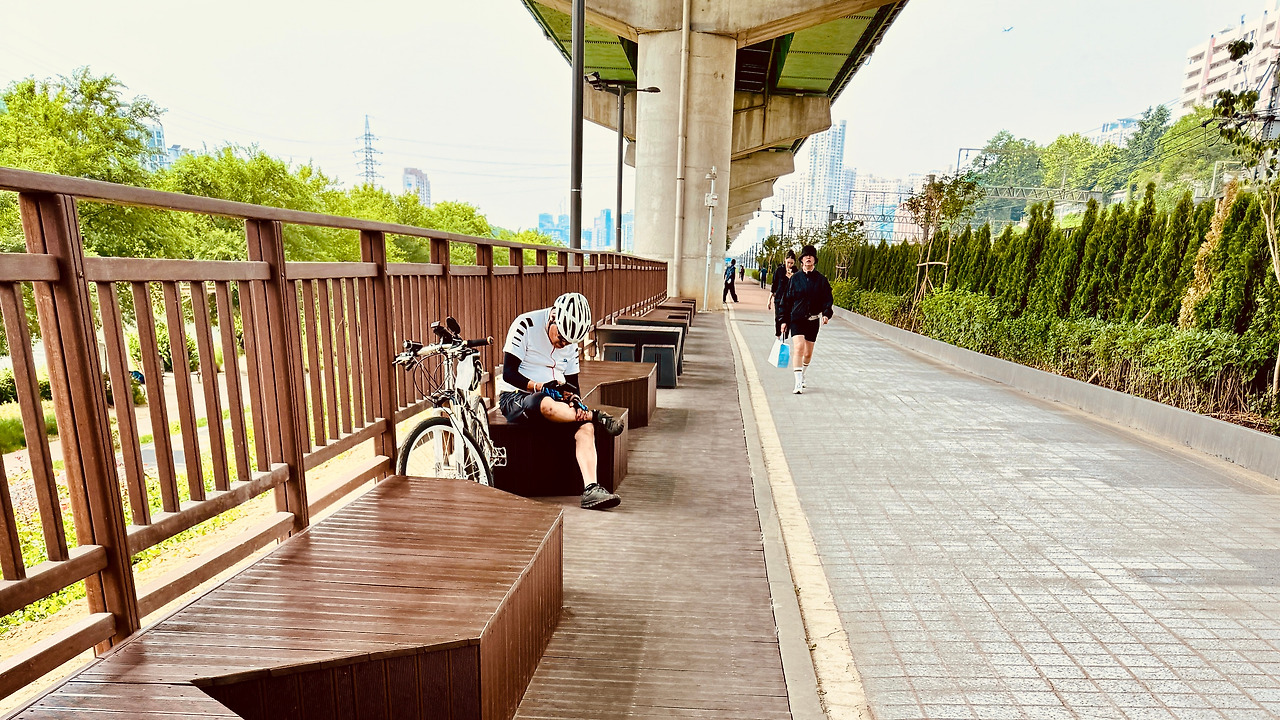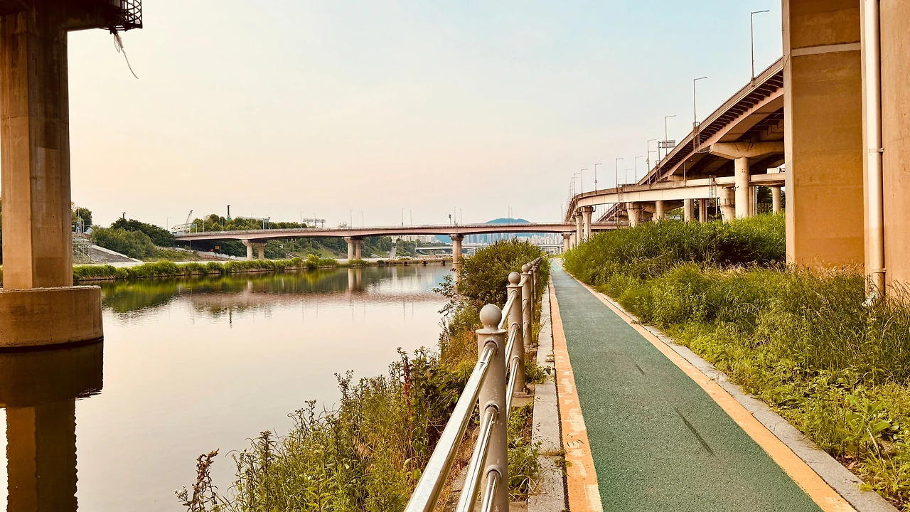 안양천을 따라 광명시에 도착하니 드디어 그늘 구간이 나오기 시작했다. 서해안고속도로에서 이어지는 ‘금천고가교’가 안양천 위에서 그늘을 만들어 주었고, 그 위치적 특성을 살려 편의시설들이 잘 설치되어 있었다. 한 동안 안 보였던 화장실도 1km 간격으로 있었고, 여기저기 운동하는 사람들과 산책 나온 사람들이 복작댔다. 화장실에 잠시 들러 머리에 물을 한 바가지 적셨다. 아… 이제는 정말 못 걷겠다는 말이 나도 모르게 튀어나왔다. 누적 83km 구간, 남은 시간은 5시간이다.