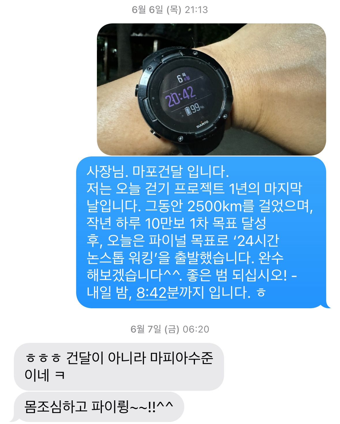 마음을 잡기 위해서라도 외부에 선언을 해야 했다. 쪽팔려서라도 마지못해 걸을 수 있도록, 얄팍한 동아줄 같은 것이 필요해 보였다. 우선 실시간으로 SNS에 출발 사실을 알렸다. 그리고 비장의 카드, 회사 사장님께도 문자를 보냈다. 나중에는 내가 미쳤지 싶었다. 정말 포기하고 싶었거든.