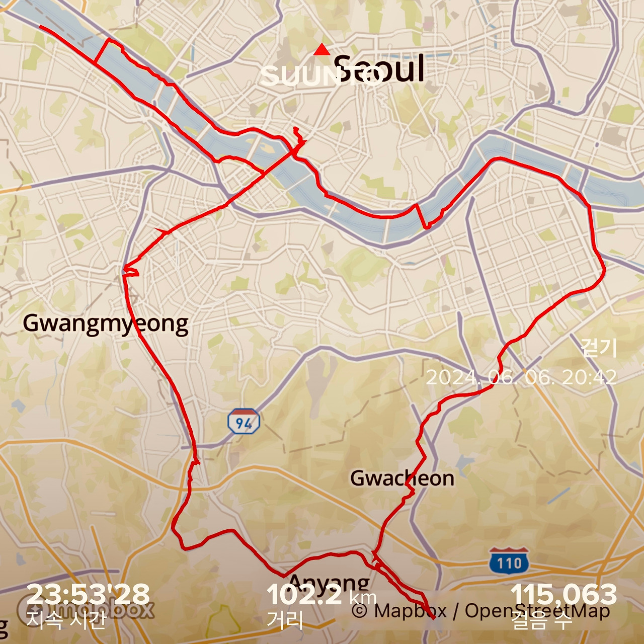 아이고, 하는 소리가 뒤에서 들린다. 마치 비장한 전쟁터에 나가는 모양새로 포옹을 하고, 어깨 툭툭 두들겨주고 집을 나섰다. 아파트 입구에서 시간을 재고, 걷기 프로그램을 켰다. GPS가 가동된다. 그리고 출발 사진을 찍었다. 24년 6월 6일, 저녁 8시 42분. 오늘 나는 ‘나의 1년간 미친 듯이 걷기’의 마지막 미션으로 ’24시간 잠 안 자고, 쉬지 않고‘ 걷기에 나섰다. 어디 플래카드라도 만들어서 걸어 놓을 정도로 이름도 멋지게 지었다. ‘24 Hours Nonsleep, Nonstop’