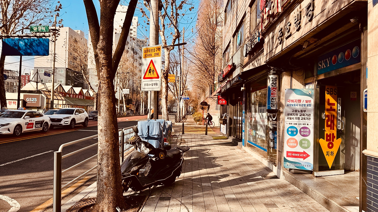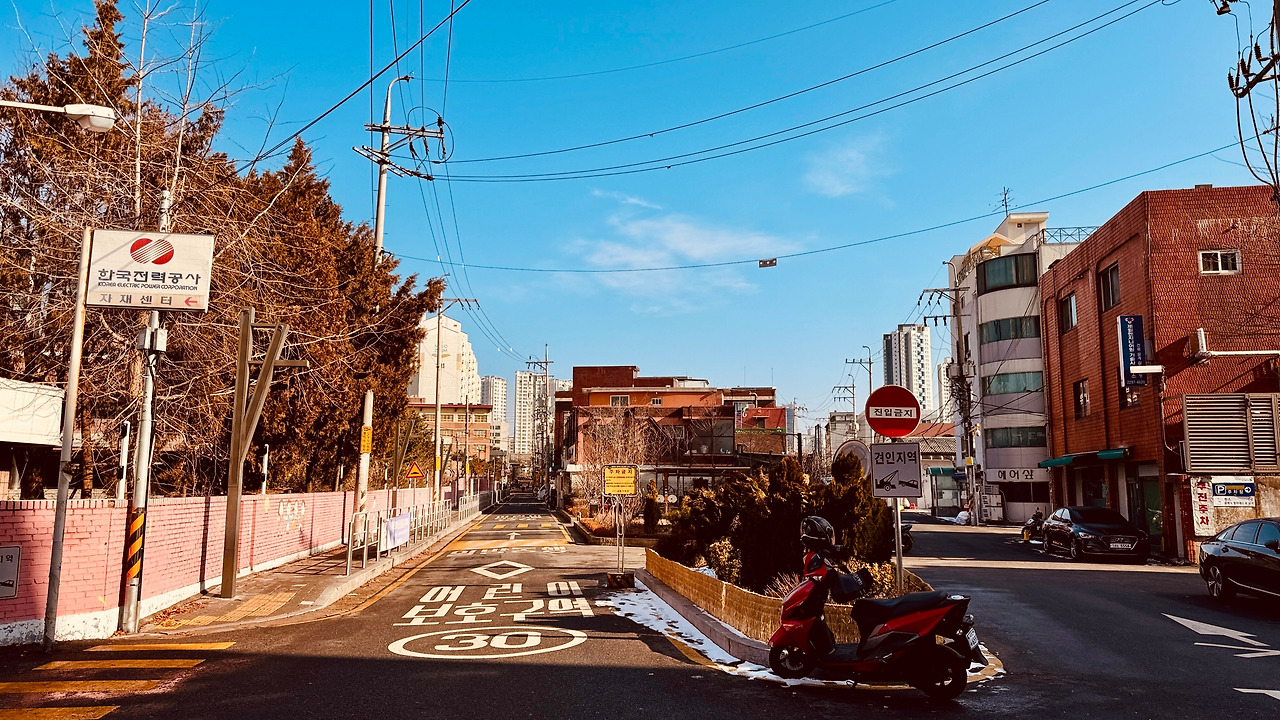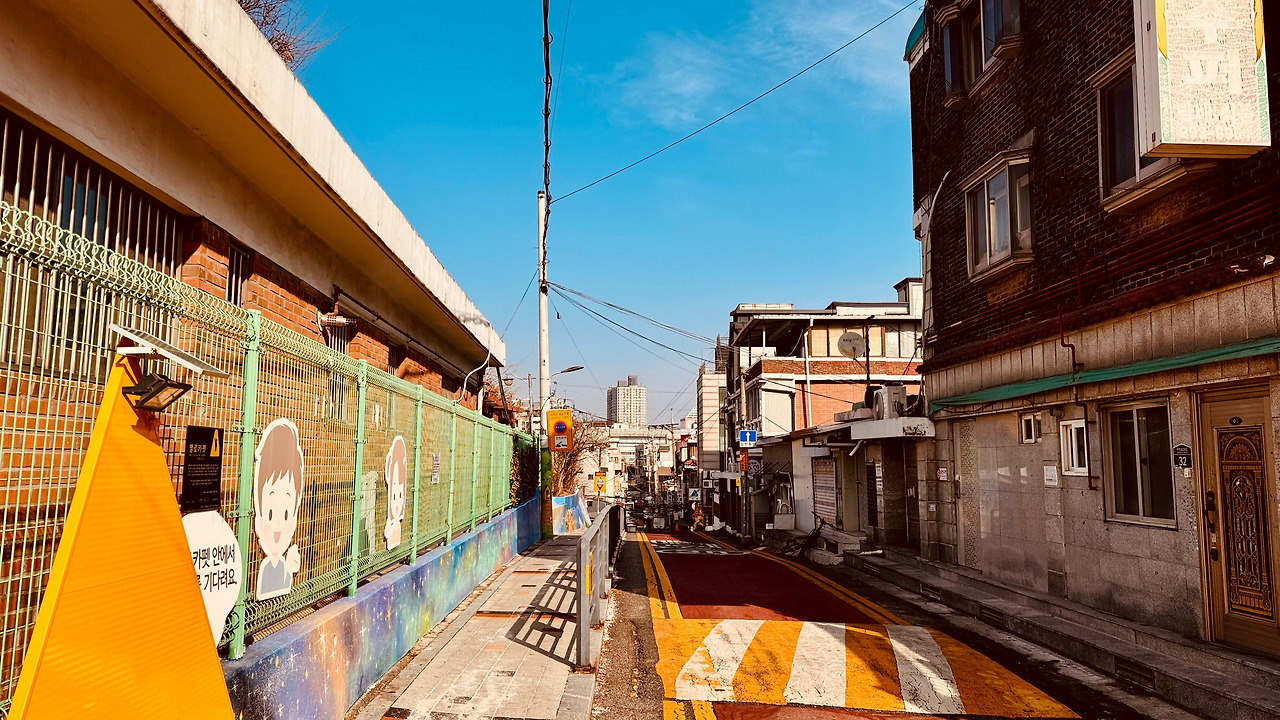 언덕이 많지는 않지만, 그나마 비스듬한 오르막이 오히려 재미를 준다. 저 앞에 노랑으로 가득한 담벼락 그림이 보인다. 미술학원에서 홍보용으로 그린 듯한데, 아기자기한 원장님의 솜씨가 돋보인다. 이곳에서 학생들을 유치하려고 땀을 흘리는 모습이 상상이 간다. 어디에서든 ‘노동은 아름답다.’