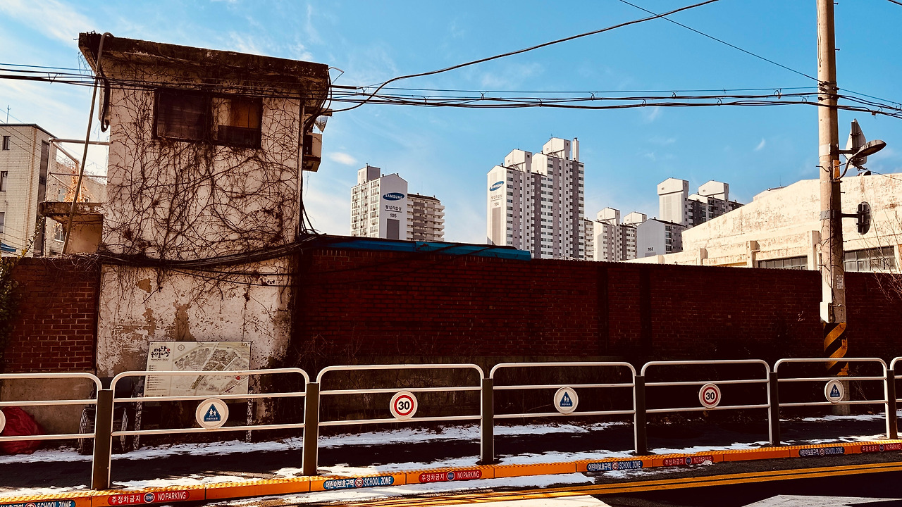 성당을 나와 왼쪽 기다란 담장을 따라 걷는다. 담벼락 뒤에는 아주 넓은 공터가 나오는데, 현재는 쓰이지 않는 ‘KT한전’ 부지이다. 붉은 벽돌과 흰색의 시멘트벽 위에 알록달록 그림들이 저마다 웃음이다. 초소인가 싶은 곳엔 오래된 덩굴이 겨울옷을 만들고 있다.