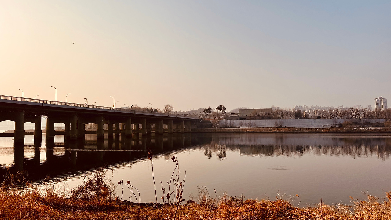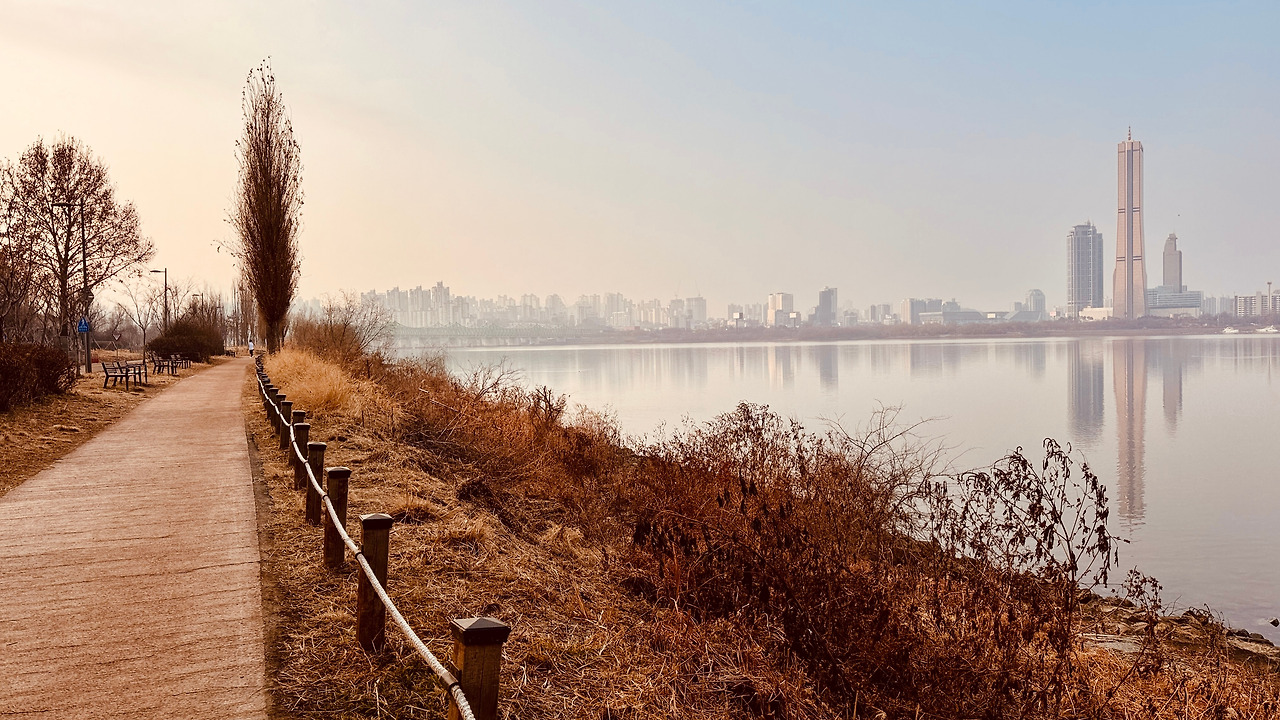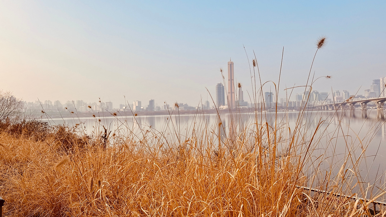 강무(江霧)라고 해야 하나? 저 멀리 황금빛 63 빌딩마저도 안개 커튼을 쳤다. 물기를 담은 공기에 상쾌한 발걸음이다. 높은 싸리나무와 겨울 갈대가 한들거린다. 이른 아침이라 혼자 걷는 강변은 온통 나에게만 땅기운을 준다. 독점이라 행복이네?