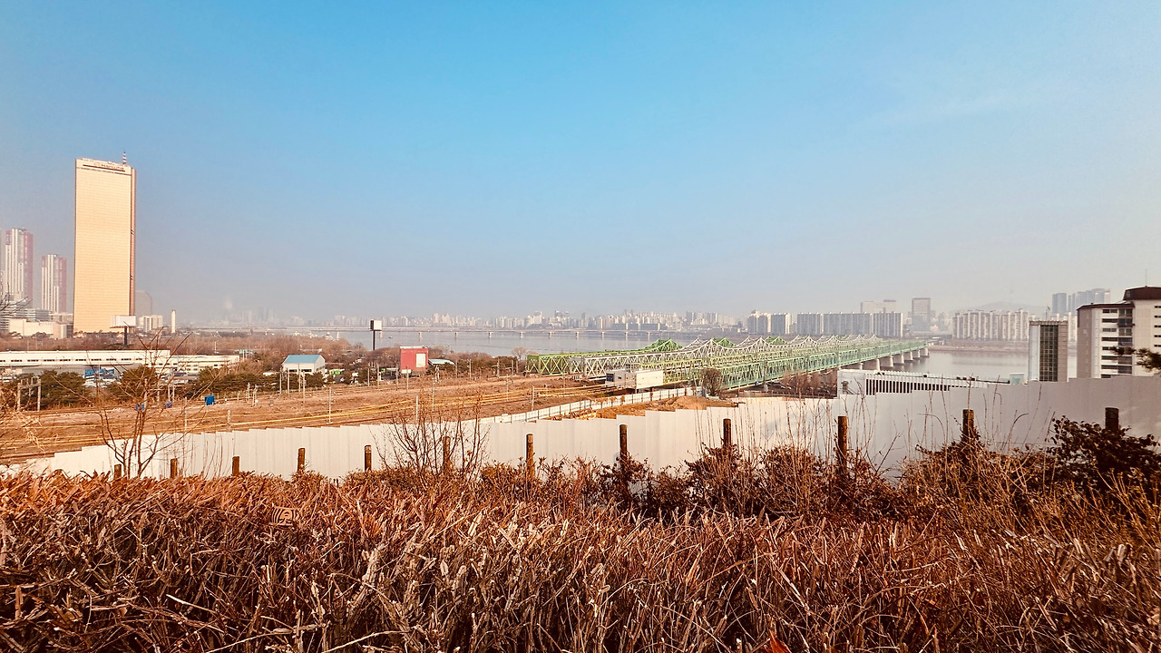 공원 자체가 50년이 다 되어가는지라, 구석진 주변으로는 낡은 계단이 덧씌운 시멘트로 범벅이다. 그 돌을 밟고 올라서니 저 너머의 한강이 눈앞에 펼쳐졌다. ‘와~ 근사하다‘ 짧은 외마디 탄성이 흘러나왔다. 풀숲이 시야를 가렸지만, 풍경을 다 감출 수는 없었다. 그 옆으로는 군사시설이 있었나 보다. 출입을 막던 표지판은 세월의 풍파를 맞고 화석이 되었다.