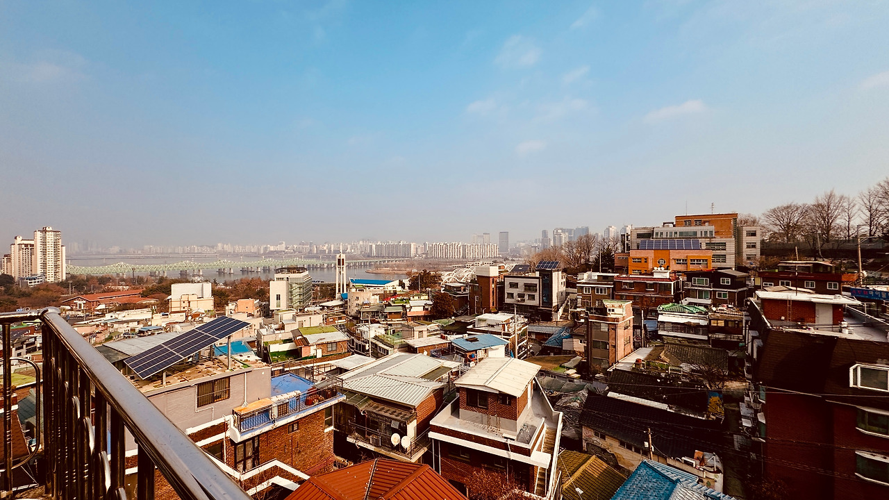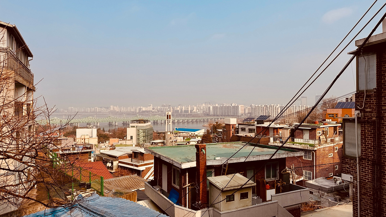 오밀조밀한 골목을 담고 몇 분정도만 오르면 정상에 닿는다. 맨 꼭대기에서 아래를 내려다보니 한강이 파노라마로 펼쳐진다. 좋구나. 새삼 감탄을 한다. 누군가는 힘들어 죽겠는데, 나는 겨우 여기 한 번을 와 보고 세상 구경한다고 좋덴다. 남이 볼까 봐 금세 감탄을 거두었다.