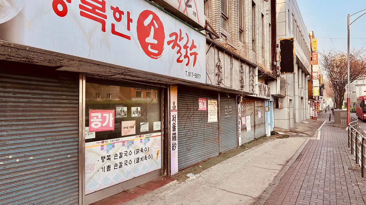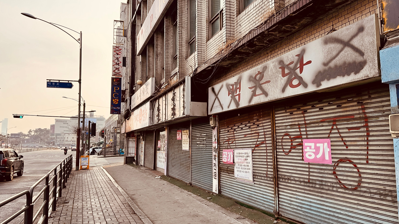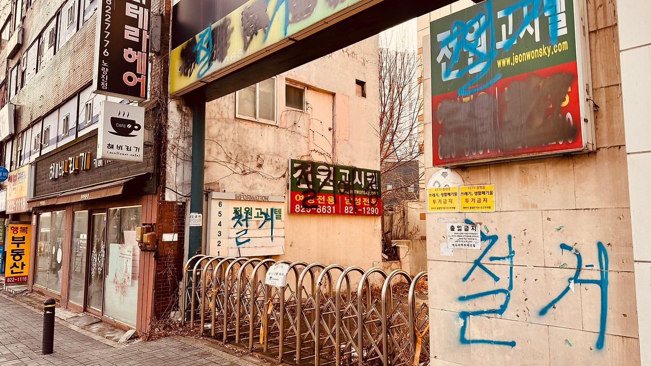 길을 건너 노량진동으로 건너는데, 한없이 낡은 건물들이 마중 나와 있다. ‘다 철거 중인 거야?’ 노량진로 대로변에 서 있는 많은 건물들이 ‘철거’라고 락카칠이 되어 있다. 재개발을 준비하는 듯, 빈 건물과 비어갈 건물들이 줄을 지어 있다. 또 한편으로는 아직 이전을 못한 식당이 운영을 한다.