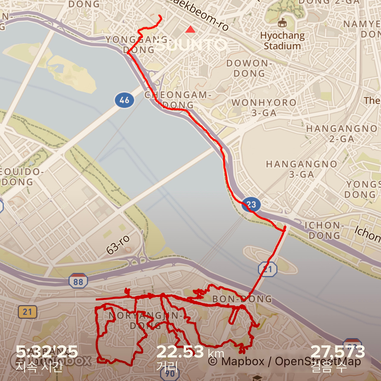 누적: 167.06km, 오늘: 22.5km, 걸음 수: 27,573