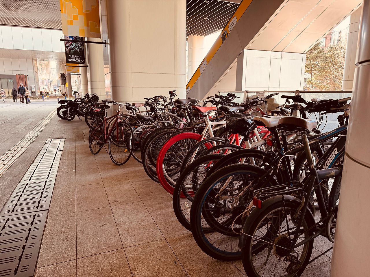 AK플라자는 숲길을 걷는 이들에게, 비나 눈이 올 때면 잠시 피할 수 있는 든든한 지붕 역할을 한다. 지붕 아래 한켠에 자전거들이 잔뜩 놓여 있다. 그것은 우리 동네 아파트 자전거를 닮았다. 녹슬고 낡은 모습을 보니 주인을 잃은 반려견 같다. ‘누가 놓고 간 걸까?’
