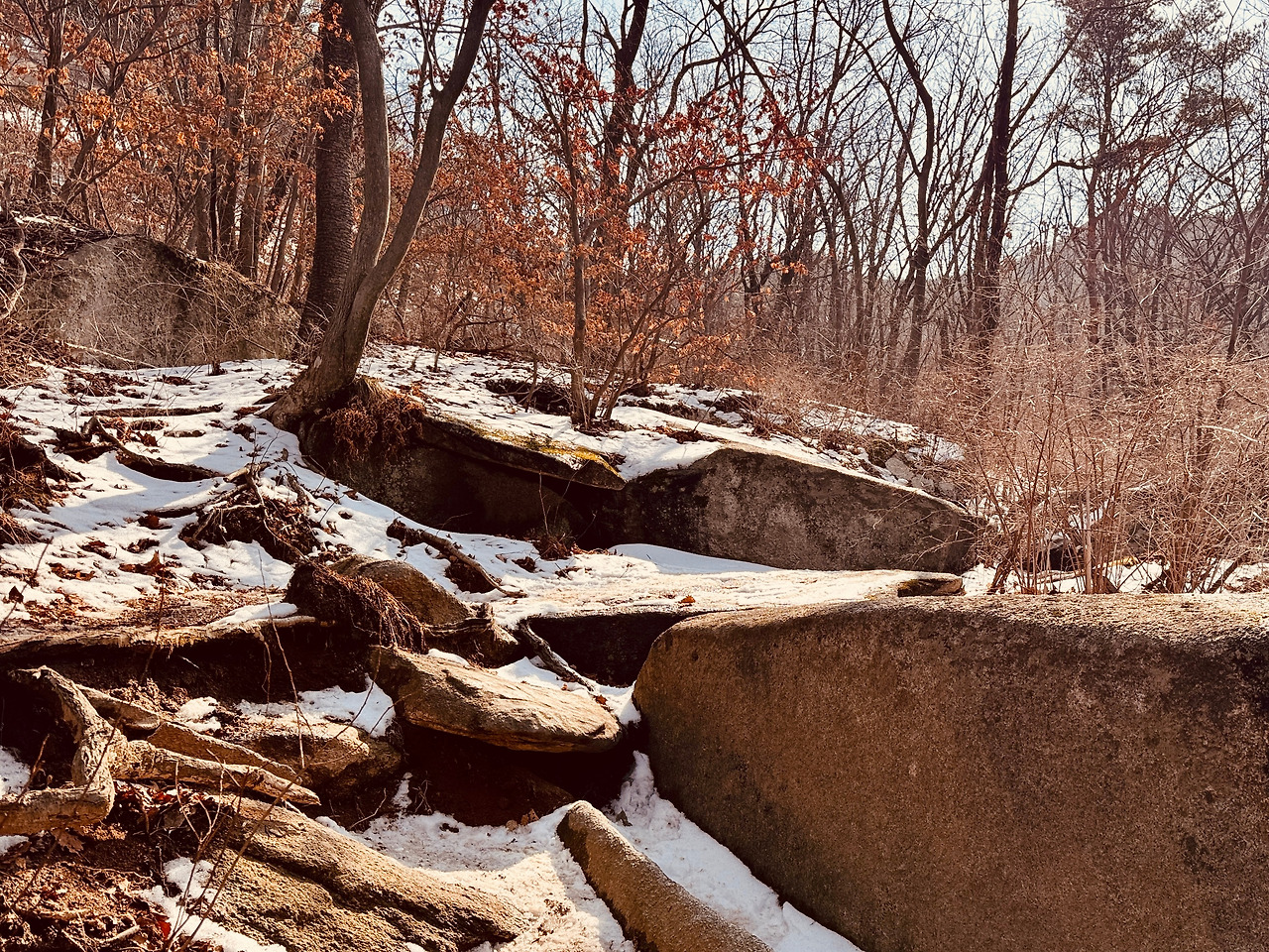 등산길 군데군데 스러진 고목나무도 인상적이다. 산 자체가 매력덩어리지만, 이곳을 지켜온 그들도 다양한 몸짓으로 눈을 즐겁게 한다. 인위적이지 않은 꺾임 그 자체는, 나무의 인생이다. 그의 삶을 다 하고, 자연으로 다시 돌아간다. 제 몸은 썩어서 다음 세대에게 자양분이 되고 주고 있다. 새 봄을 기다리는 숲의 정령들이 산새 소리를 따라 어슬렁 거리는데, 귀가 즐겁다.