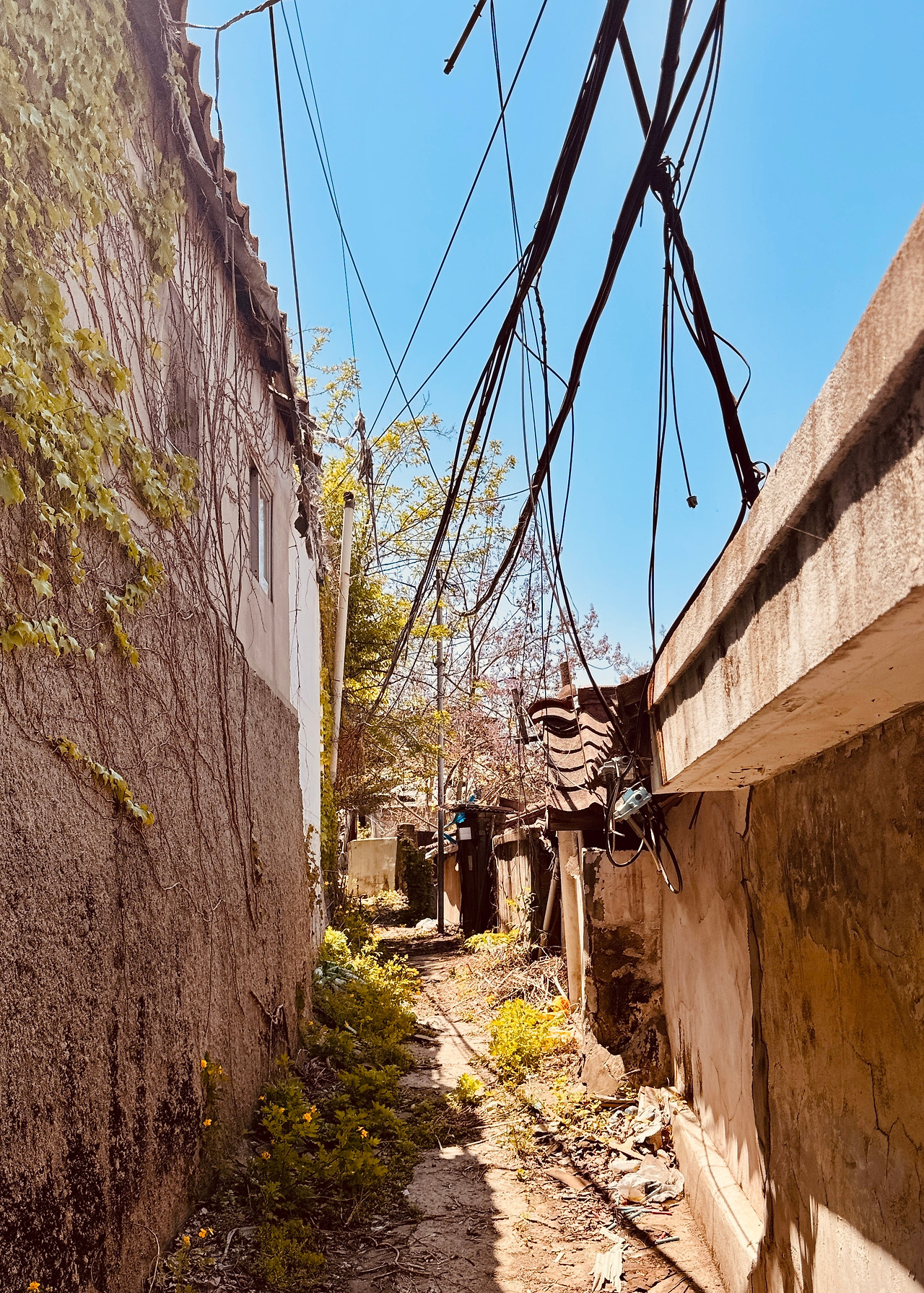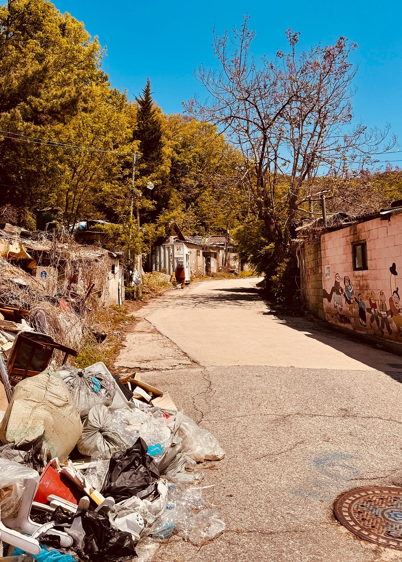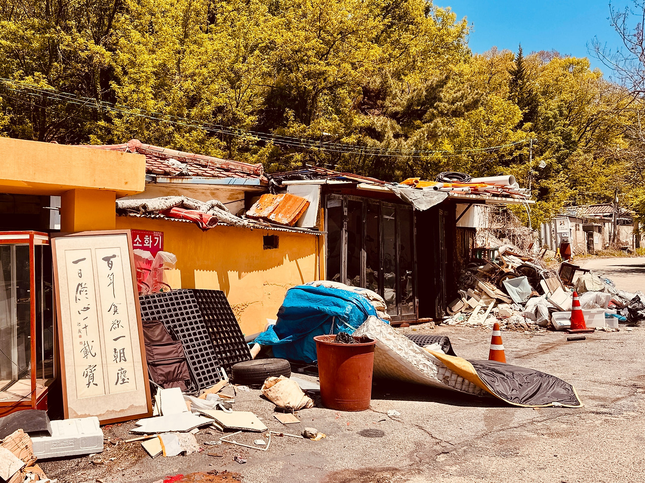 역시, 마을 주민들은 보이질 않았다. 거주하는 이가 거의 없다고 들었는데, 아예 한 분도 안 보인다. 좁은 길가 에는 다 허물어져 가는 담벼락에 집이 기대어 있는 모습이다. 창문은 깨져있고, 그 앞에는 버리고 간 세간살이가 흔적으로 남아 있다. ‘마을에 들어가도 되나?’ 아무도 없으니 참 부담스럽다. 혹시 몰라, 대 놓고 사진 찍기도 어려웠다.