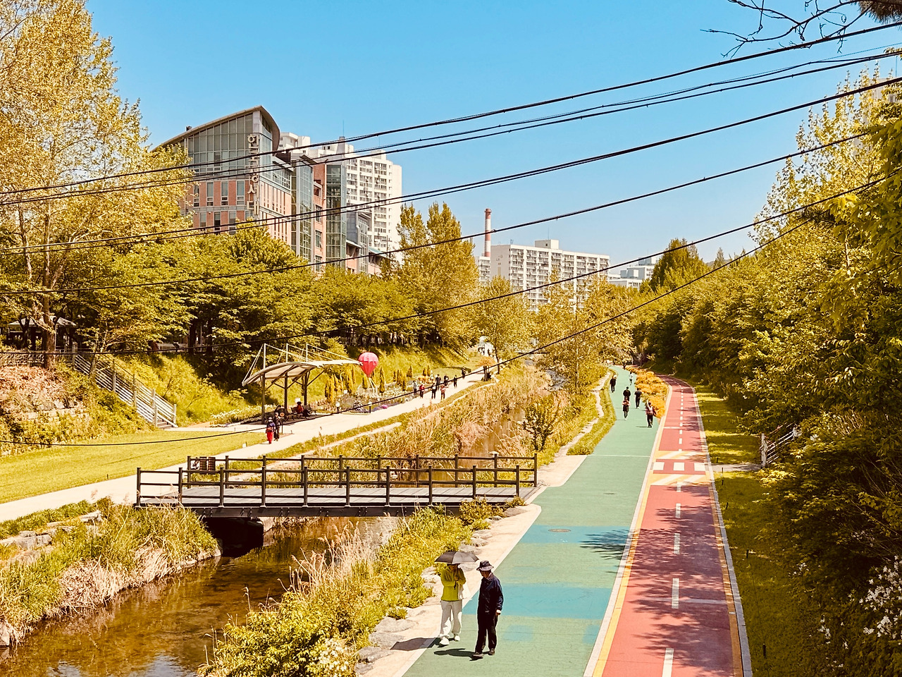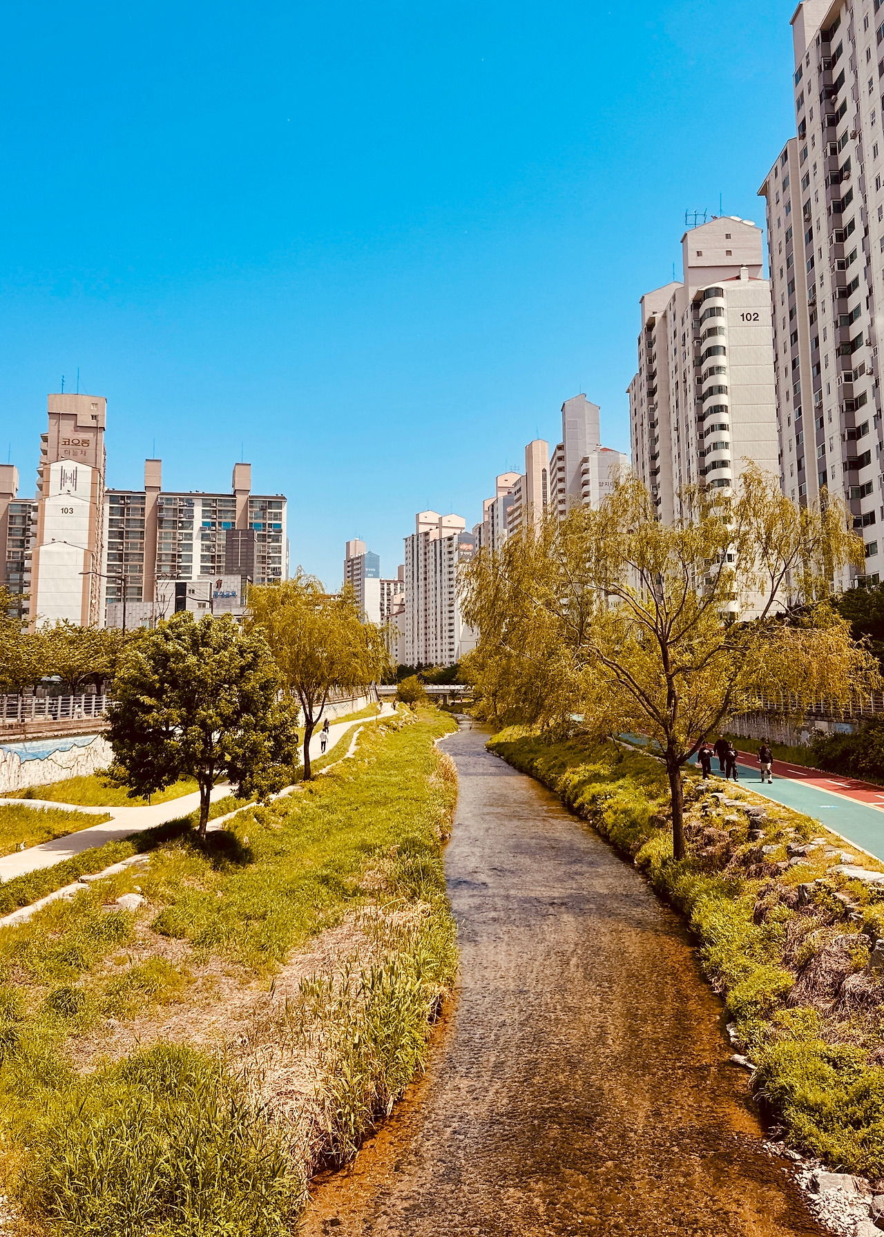 중계역에 내려 두리번두리번, 큰 대로변을 옆으로 천 하나가 흐른다. ‘무슨 천이지?‘ 하며 살펴보니, ‘당현천 기억길’이라 씌어 있다. 당연히 ‘당현천’인가 보다. 초록초록한 나무 사이로 운동하는 사람들이 한가롭고, 뜨겁지 않은 하늘은 파랑색 크레파스보다 더 파랗다.