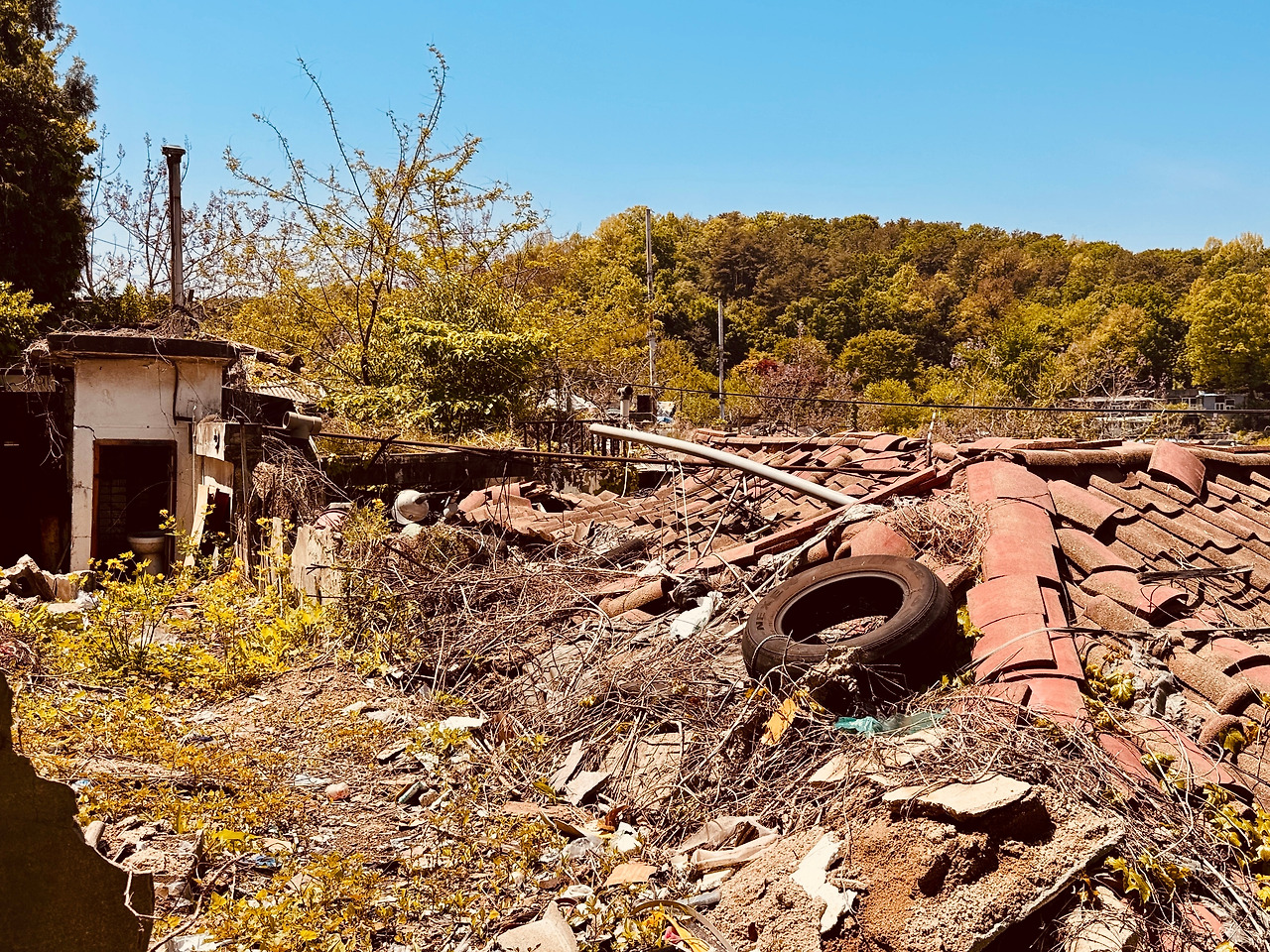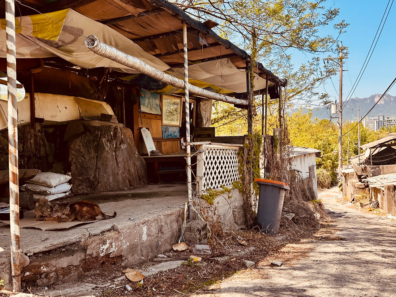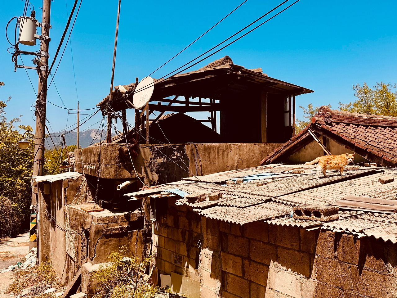 마지막 골목을 나서는데 어떤 젊은 여성 한 분이 고양이에게 사료를 주고 있었다. ‘와… 나도 무서운데 여기를 혼자 왔다고? 고양이 때문에?’ 대단하다. 보니까, 쓰러져가는 처마 밑에도, 지붕 위에도 고양이 여럿이 돌아다니고 있었다. 어디서든 사람은 떠나도 남는 건 반려동물뿐인가 보다. 녀석들 배고프지 말라고 음식을 가져다주는 일은, 귀신도 피해 가는 그녀의 사랑이다.