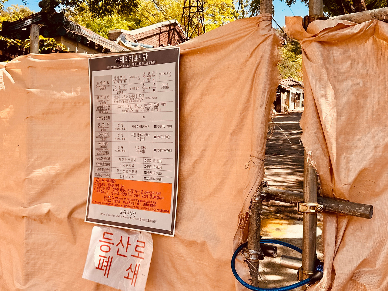 백사마을에 가까워질수록, 저 멀리 ‘불암산’도 가까워졌다. 어느새 아파트도 드문드문 해지더니, 드디어 마을 입구가 보였다. 재개발을 환영하는 현수막이 가득하다.