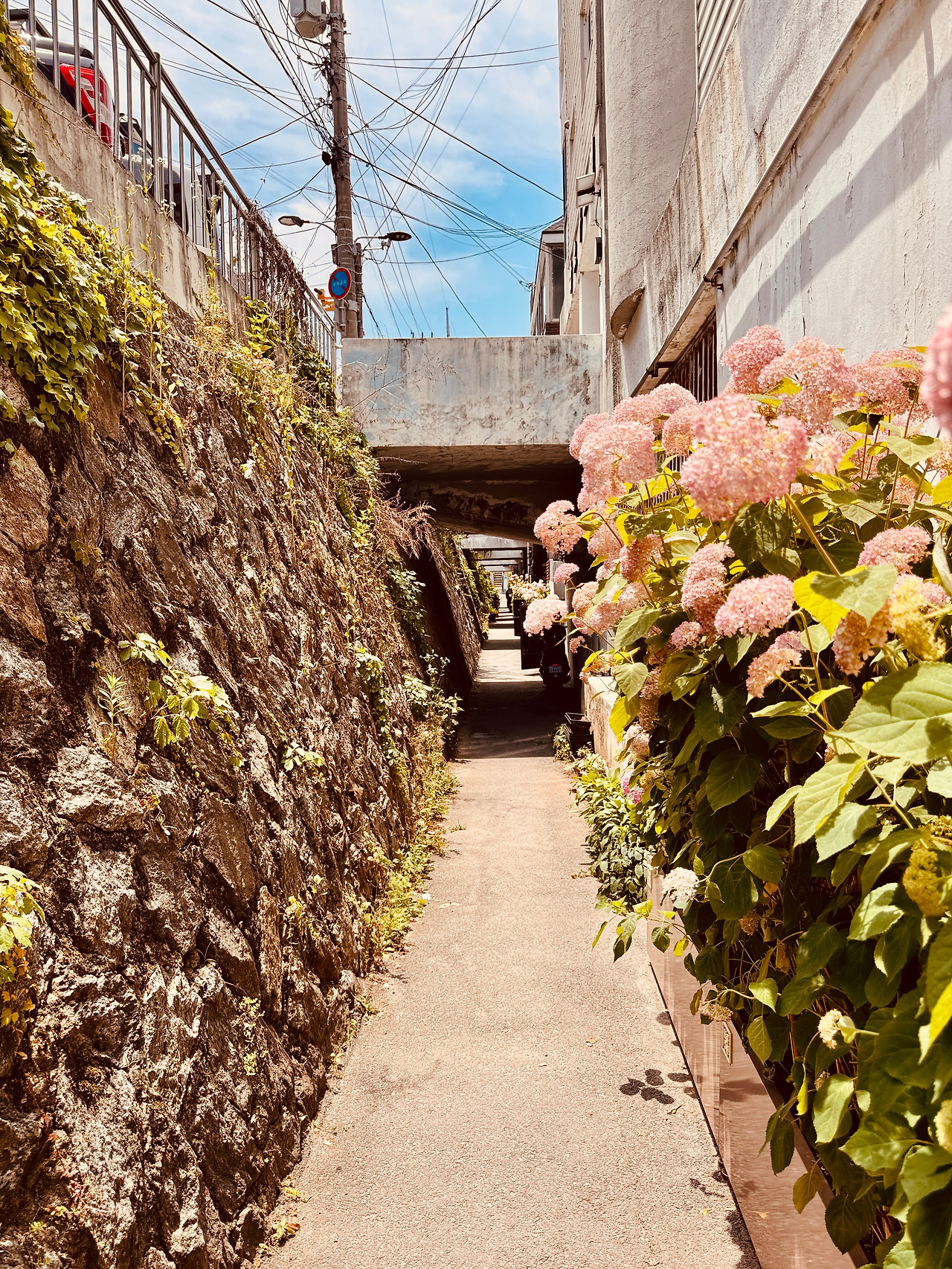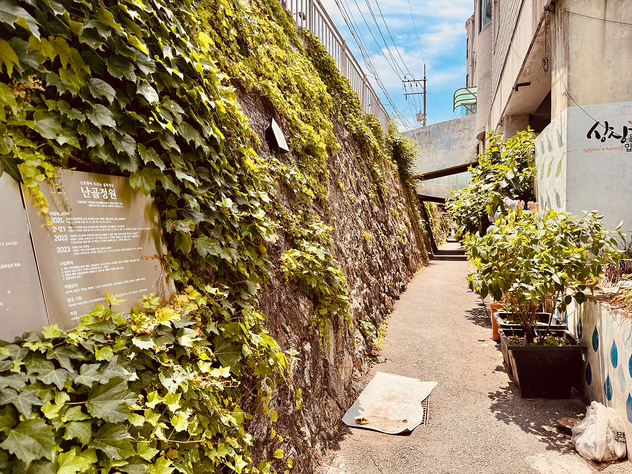 물을 한 모금 마셨다. 땀 한 방울이 뚝 떨어진다. 난곡동길의 끝은 다소 오르막이었다. 높은 곳일수록 집들도 세월의 흔적이 가득했다. 화강암 가루가 묻어나는 담벼락과 붉은 벽돌은, 서울 도심에서 쉬이 찾아보기 힘든 풍경화다. 돌의 표면을 만져보니 그래도 오랜 세월을 견디었다고 근육질이다. 계단이 나오길래 돌아갈까 하다가, 마치 나도 여기 주민인 양 자연스럽게 한발 두발 올라탔다. 그 끝에 오르니 수국이 만발한 무릉도원 ‘난골정원’이 나온다. 오래된 아파트와 정원길을 하나로 엮었는데, 그 컨셉이 매우 독특했다.