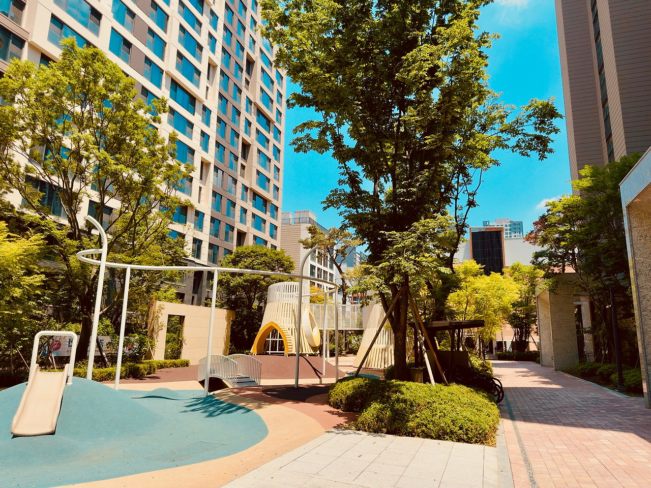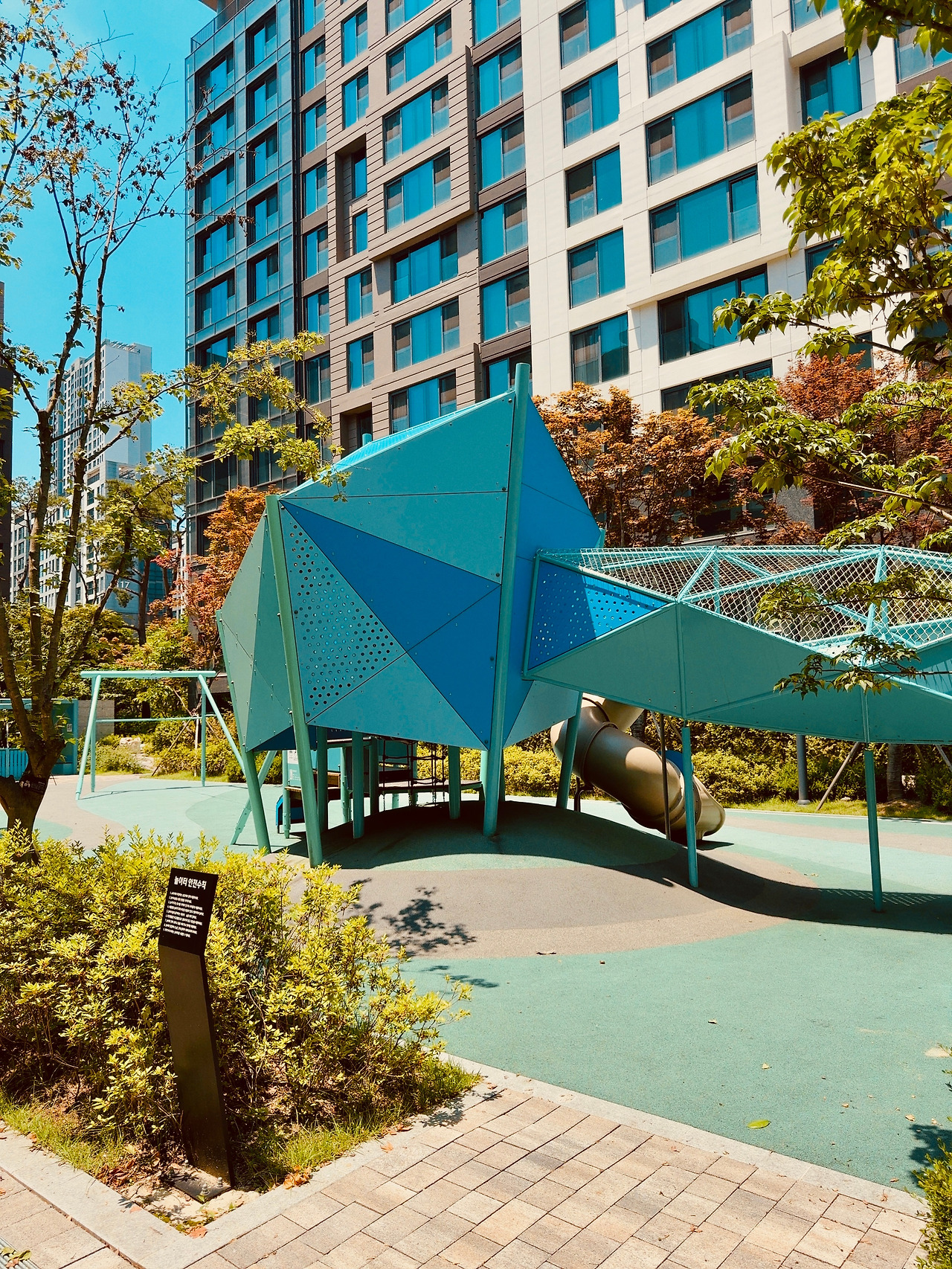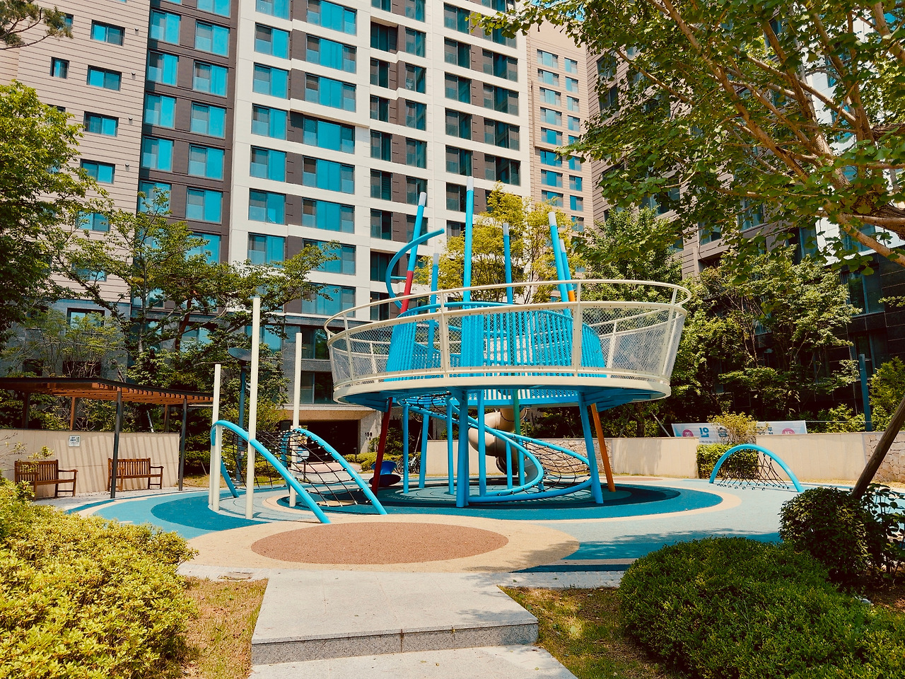 어쩜… 놀이터마저 예술이구나! 단지 내 곳곳에 놀이터가 하나씩 있는데, 마치 서로 다른 디자이너가 그림 그리듯 경합했다. 날이 너무 뜨거워 홀로 외로울 법도 한데, 전혀 외로워 보이지 않았다. 하나의 작품처럼 벽에 걸린 그림 같았다.