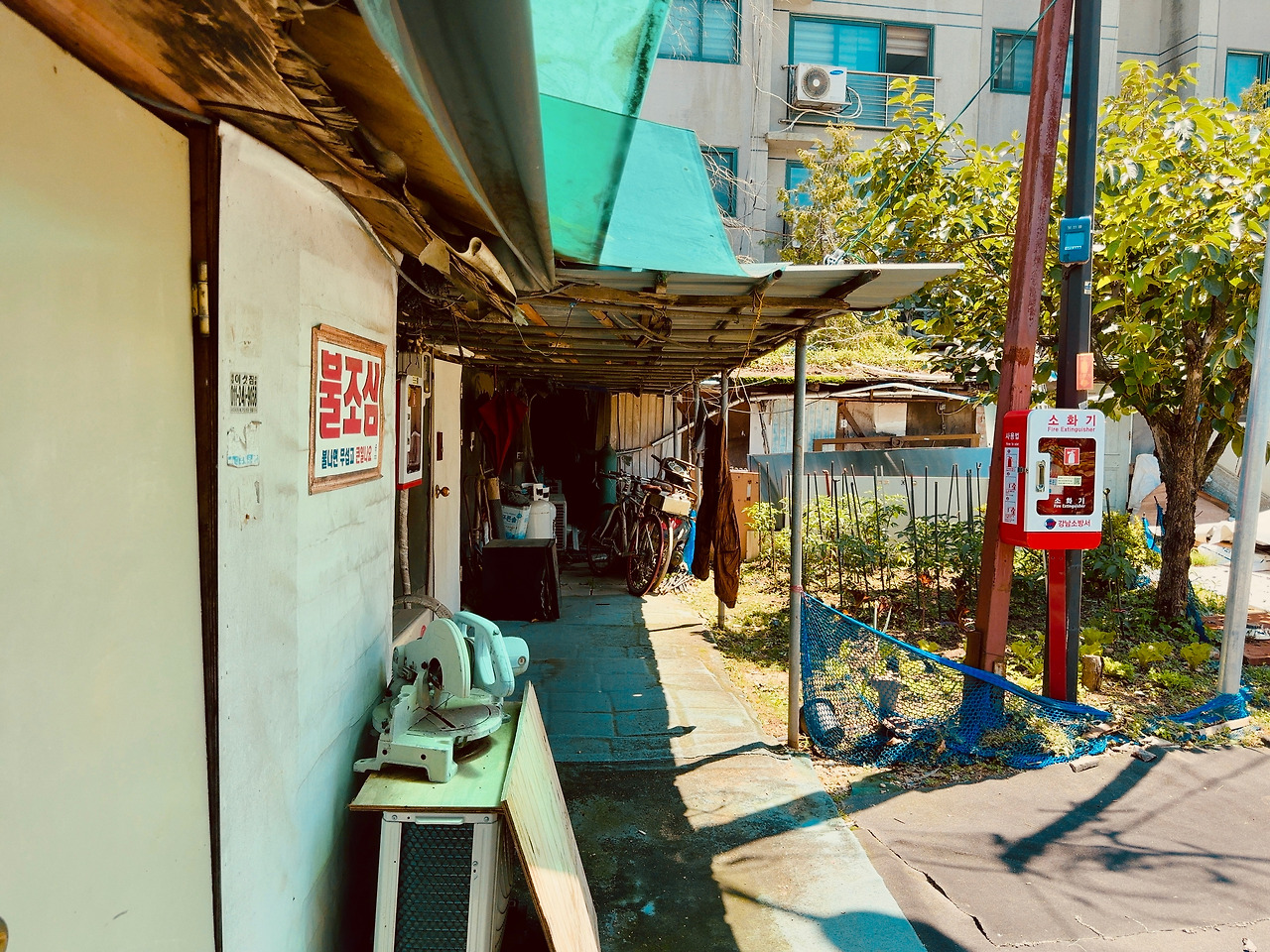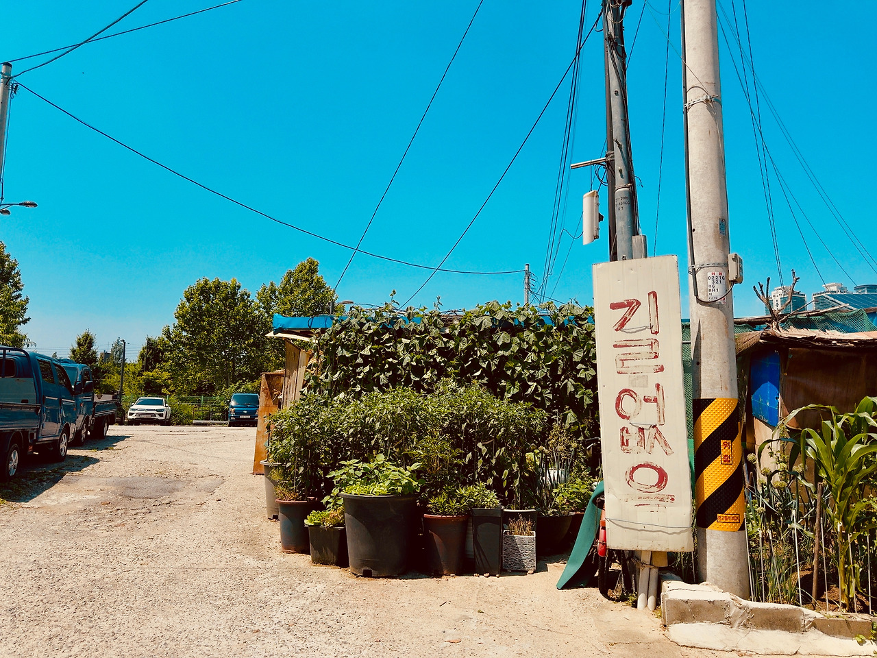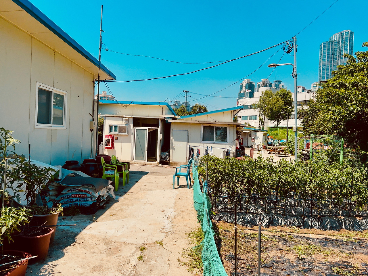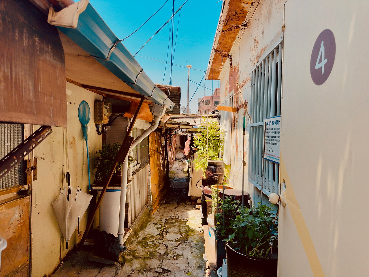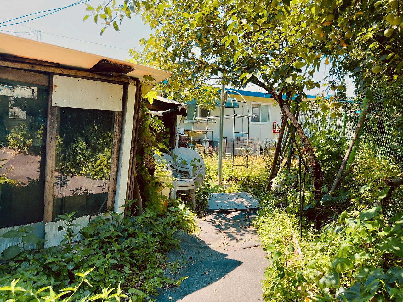 골목 시멘트 바닥은 울퉁불퉁하고, 발목이 살짝 꺾일 정도로 돌길과 흙길이 섞여 있었다. 한두 분의 주민들은 이방인에 관심 없는 듯 내 옆을 지나쳐 가거나 자기 일에 집중이다. 슬핏 곁눈질로 집들을 스쳐 보는데, 구룡마을과는 또 다른 느낌이다. 골목은 다소 넓었고, 햇빛이 쨍하니, 마당 앞에 심어 놓은 고추나무도 반들거린다. 슬라브 가건물이 고단해 보이지만 또 공기마저 한가로웠다. 집 파리 한 마리가 웽~ 하고 날아간다.