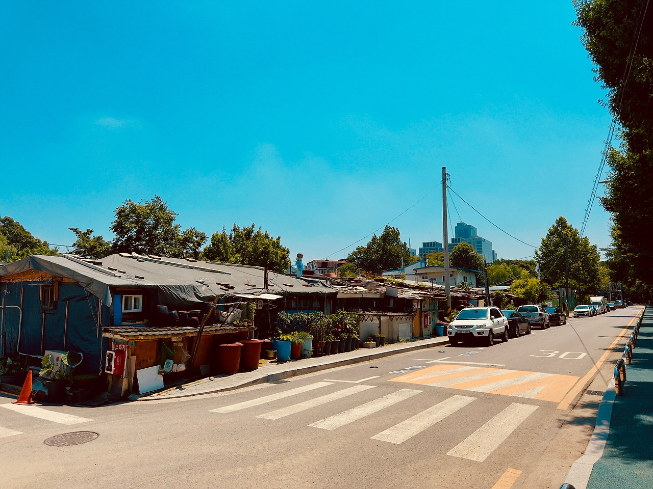 동네 한복판에 ‘수정마을’이라고, 벽으로 둘러싸인 빈민촌이 있다. 생각지 못했던 만남이다. 이런 데에 이렇게 철거하지 못한 마을이라니? 구룡마을과 비슷하면서도 나름 정비가 되어 있다. 네모 반듯하게 사방이 집벽으로 막혀 있고, 입구 하나가 보이긴 했는데 차마 들어가진 못했다.