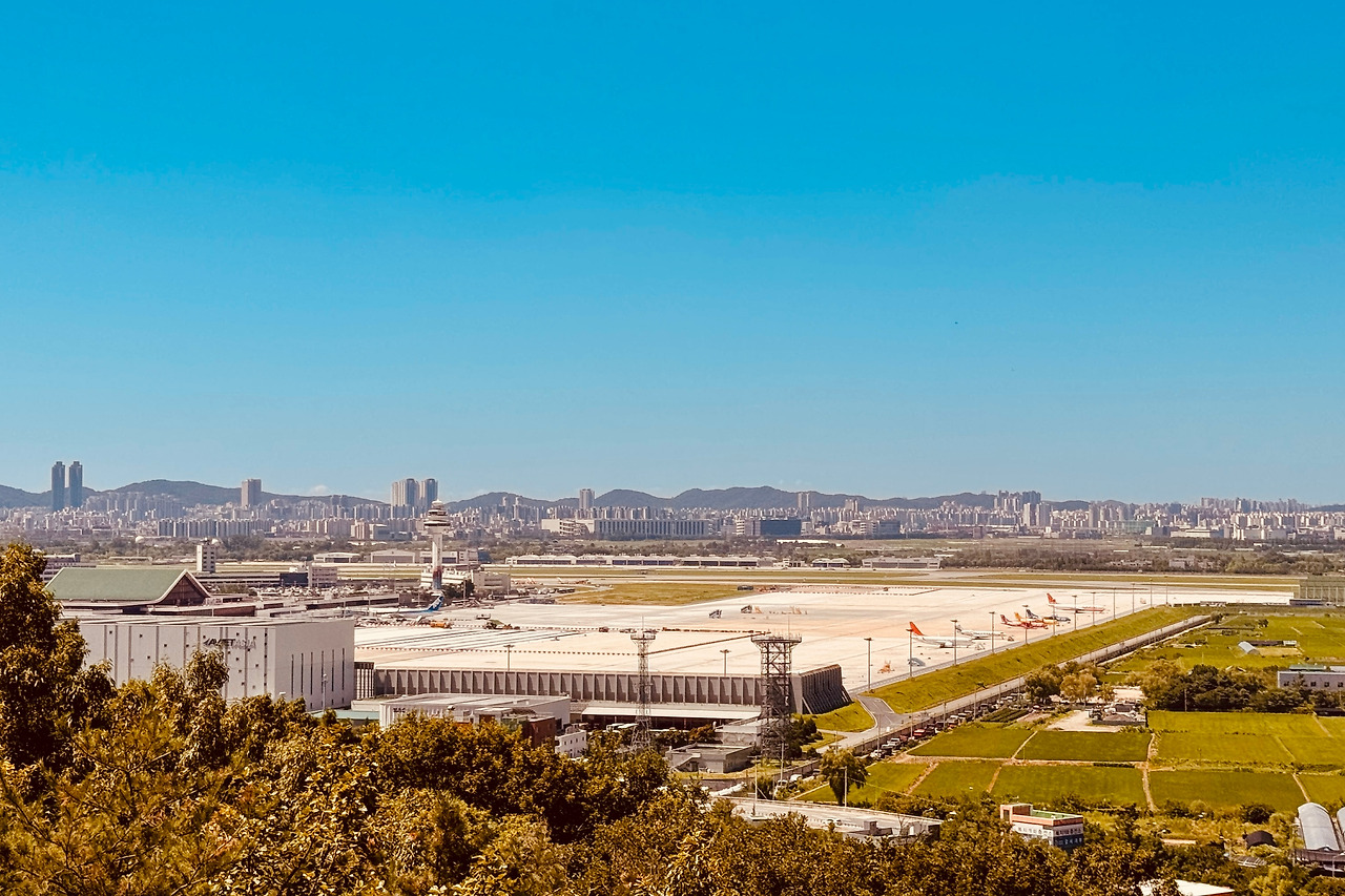 한번 와 봤던 길이어서인지, 개화산 가는 길이 그닥 낯설지는 않았다. 산 정상까지 20분이면 닿고, 중간 즈음에 ‘김포공항’을 내려다볼 수 있는 전망대까지도 10분이 채 걸리지 않는다. 전망대에 이르니 역시나 한눈에 쨍하게 들어오는 경치가 끝내준다. 김포공항은 이제 동네 편의점처럼 느껴진다. 인천공항이 이마트라면, 김포공항은 GS25 쯤 된다. 멀리서 보니 학교 운동장 같다.