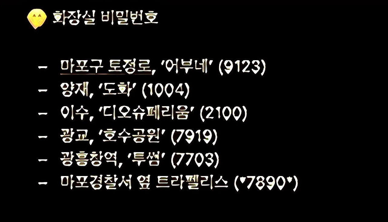 하지만 또 막상 찾을 때는 잘 보이지도 않는다. 아니 그것보다는 나의 방문을 쉽게 허락하지 않는 화장실이 대부분이다. 그래서 평소에 화장실 위치를 잘 적어두고, 심지어는 비밀번호도 기록해 두어야 한다.