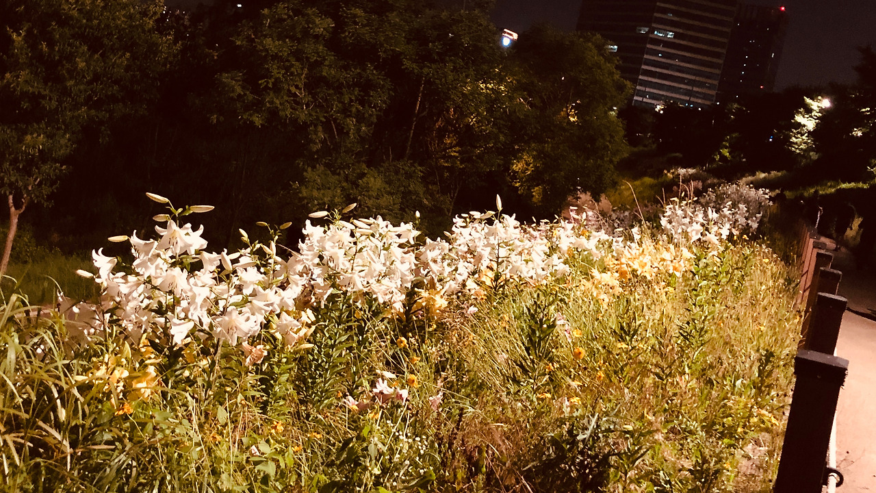 가는 길에 너무 좋았던 것이 수백 미터에 달하는 백합꽃길이었다. 밤에 보아도 백합의 자태가 흐트러지지 않는 걸 보니, 낮길이었다면 더욱 환상이었을 것 같다. 7월은 가히 백합의 계절이다. 벚꽃길 안양천이 절대 부럽지 않은 백합길을 걷다 보니, 노래 한 소절이 절로 나왔다가 급히 거둬들였다.
