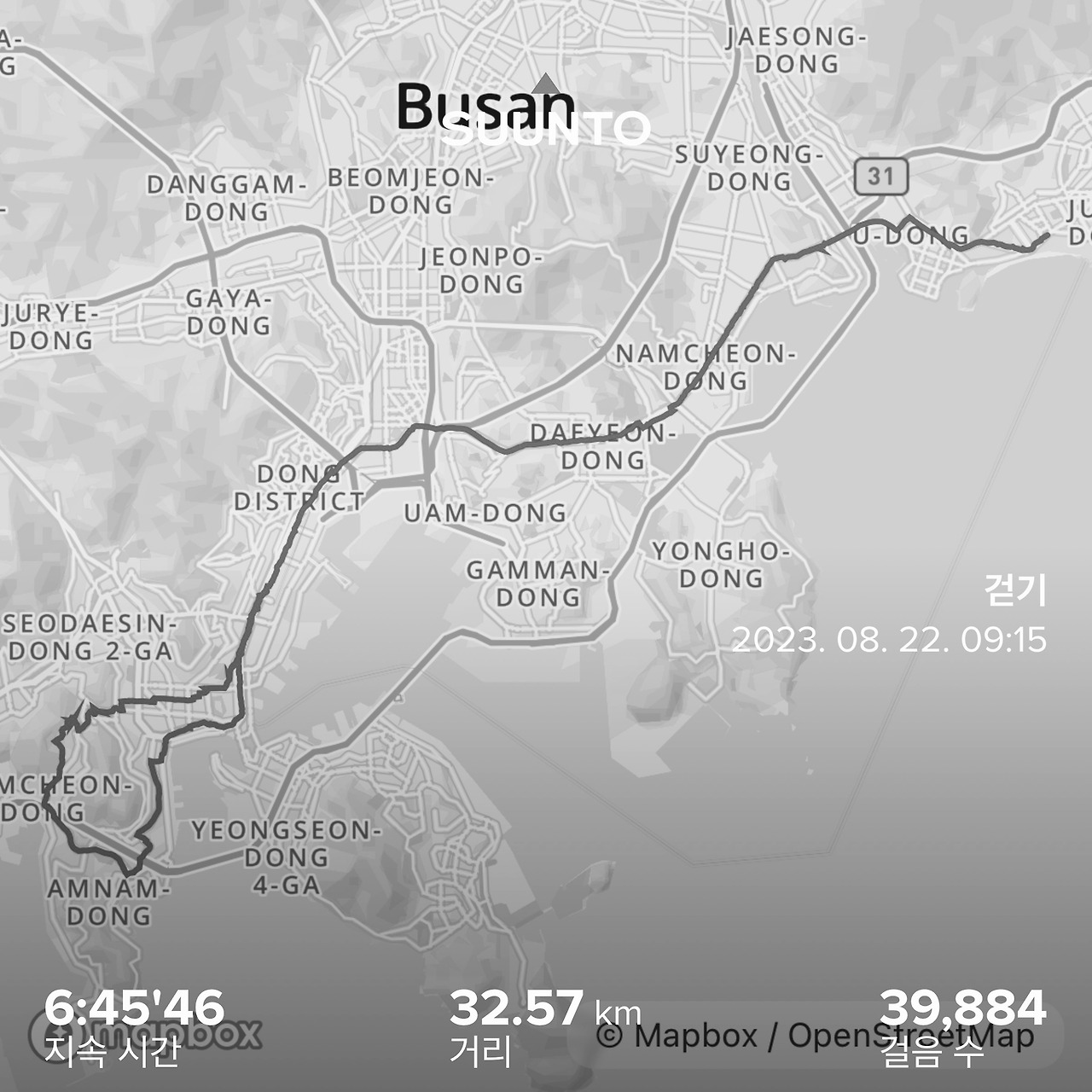 오늘 부산 첫날부터 강행군이었다. 시계 GPS가 32km를 가리킨다. 대단하네. 어쩌면 내일은 더 많은 거리를 걸어야 할지 모르겠다. 게다가 날씨 예보를 보니 오늘보다 더 최악의 폭염이다. 그냥 내일은 내일로 맡기고, 온몸이 땀으로 쩔어 빨리 샤워를 하고픈 마음이다.
