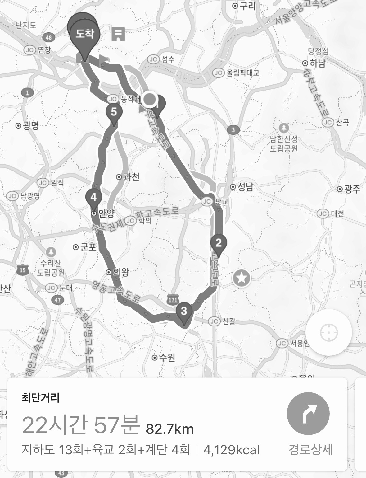 그 과정에서 나는 이즈음이면 충분히 10만보를 달성했을 거라 생각하고 버스를 탔다. 버스에서 앱 전환이 되면서 확인을 해 보니 9만보라고 찍혔다. ‘헐! 산을 그렇게나 탔는데, 10만보도 안된다고?‘ 나중에 알았다. 산을 타면 오히려 걸음 수가 적게 나온다는 것을. 그렇게 부리나케 사당에서 버스를 내렸다.