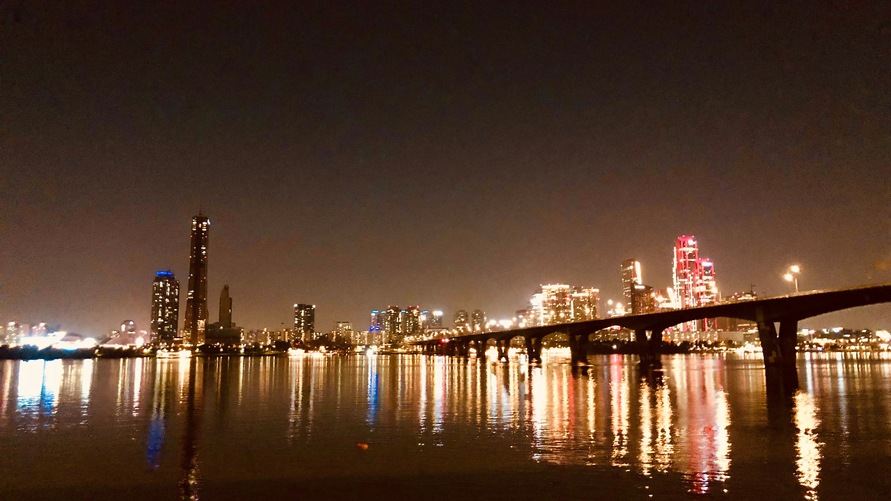 한강대교와 노들섬이 새벽 깊은 곳에 두둥실 떠 있다