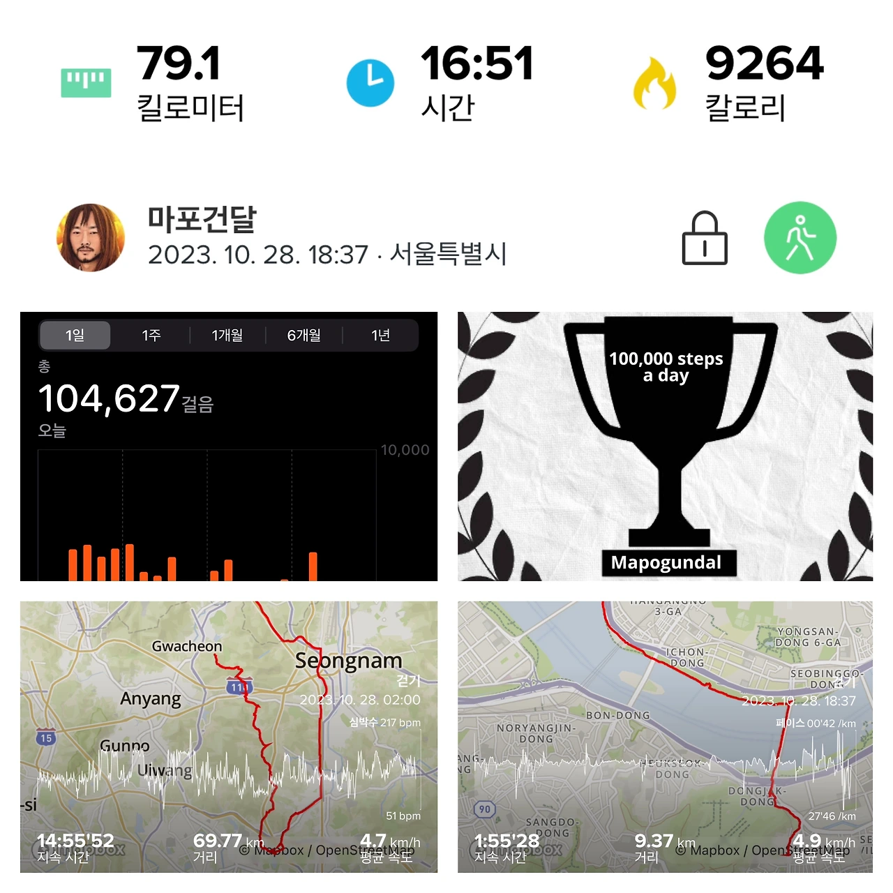 마포 > 양재 > 분당 > 광교 > 수원 > 고기리 > 청계산 > 과천 > 사당 > 마포로 이어지는 총 거리 79.1km, 104,627 걸음