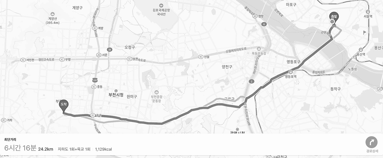 그래. 나는 당장의 큰 정보 없이, 일단 부평으로 가야겠다는 생각이 들었다. 마침 어느 동네를 파헤칠지 고민하고 있던 차에, 권지영이 말하는 ‘모녀떡볶이’도 먹어볼 겸 좋은 지역이라고 생각했다. 왕복으로 갔다가 돌아오기에는 꽤나 멀었다. 무려 48.8km. 아무래도 왕복은 무리일 듯싶다. 지난주 성수동 일정이 생각보다 힘이 들었던 관계로, 나는 아직 내 온몸의 젖산이 채 빠지지 않은 상태였다. 오늘은 편도로 다녀오는 것이 좋을 것 같다.