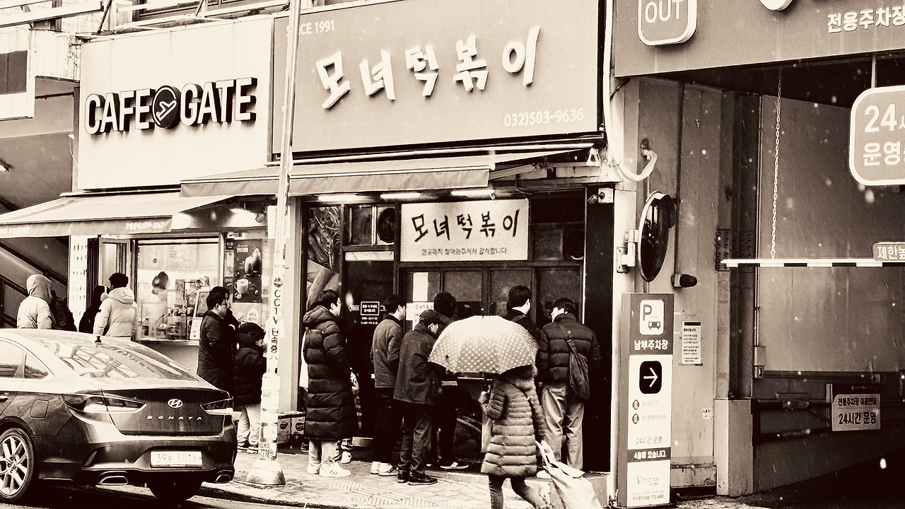 드디어 부평에 들어섰다. 소곤소곤 내리는 비를 다 맞고 왔더니, 강줄기 마냥 옷이 젖어 있다. 툴툴 털어버리고 건물 안으로 들어가야 한다. 저 멀리 오늘의 목적지인 ‘모녀떡볶이’ 집이 보인다. 나이불문, 손님들이 참 많다. 다들 밖에서 대기를 타고 있다. ‘이런, 나처럼 멀리서 걸어온 손님에게 주는 특혜, 이런 것은 없을까?