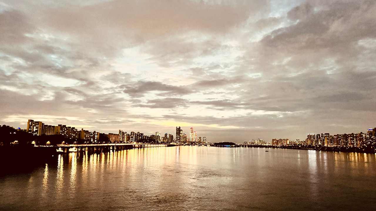 동작대교 위에 올라서니 몇몇 사진 찍는 사람들도 보이고, ‘헐! 이 폭염에 결혼사진을 찍나?’ 한 여성이 신부옷차림으로 여러 스태프에 둘러싸여 옷매무시를 고르고 있다. 언제 비가 와도 이상하지 않을 날씨인데, 갑자기 비라도 쏟아지면 어쩌나? 하고, 그들은 아무 관심도 없는 걱정을 나 혼자 하고 있다. 게다가 밤이잖아? 야경? 그래, 동작대교에서 바라본 저기 저 여의도 전경은 희끄무리하면서도 불빛에 밝아 몽롱한 감상을 주기에 충분했다.