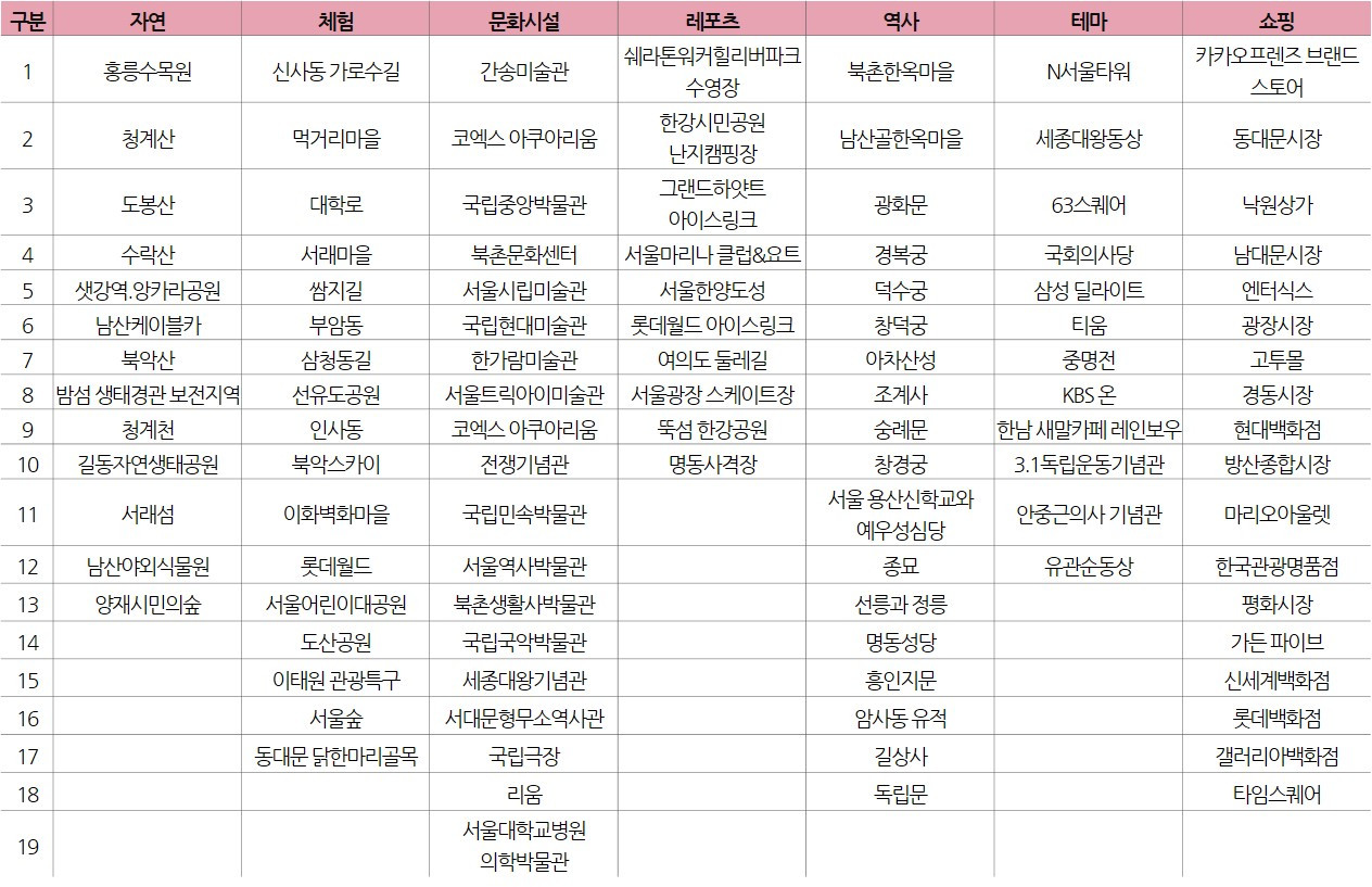 데이터를 수집하기 위하여 한국관광공사에서 제공하는 관광지 데이터를 이용하였다. 한국관광공사에서는 관광지를 7개의 카테고리 - 자연, 체험, 문화시설, 레포츠, 역사, 테마, 쇼핑 - 로 나누어 제공하고 있는데, 조회수가 높은 것 위주로 10~19개의 POI(point of interest, 관심지점)를 가져왔다. 결과적으로 총 106개의 POI 데이터를 수집하였으며, 그 목록은 아래와 같다.