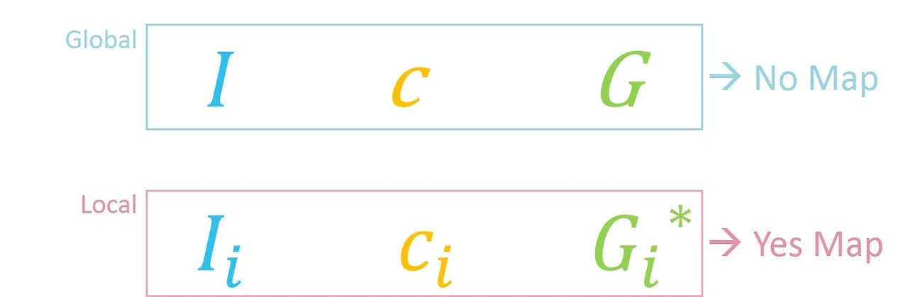위 그림에서 위에 있는 것들은 전역적(global) 통계량, 아래 있는 것들은 국지적(local) 통계량이라고 한다. 그래서 I의 경우, 위의 것은 global Moran's I라고 하고 아래 것은 local Moran's I라고 한다.