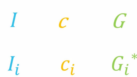 공간통계분야의 논문을 읽다보면 통계량을 나타낼 때 'i(아래첨자)'와 '*(위첨자)'가 자주 사용되는 것을 볼 수 있다 . *에 대한 설명은 지난 게시물에서 다루었으니, 오늘은 i에 대해 이야기해 보려 한다. 아래 그림에서 I는 Moran's I, c는 Geary's c, G는 Getis-Ord의 G를 나타내며, 이것들은 모두 공간 통계량이다. 그러면 아래 첨자로 i가 붙어 있는 것들이 의미하는 바는 뭘까?