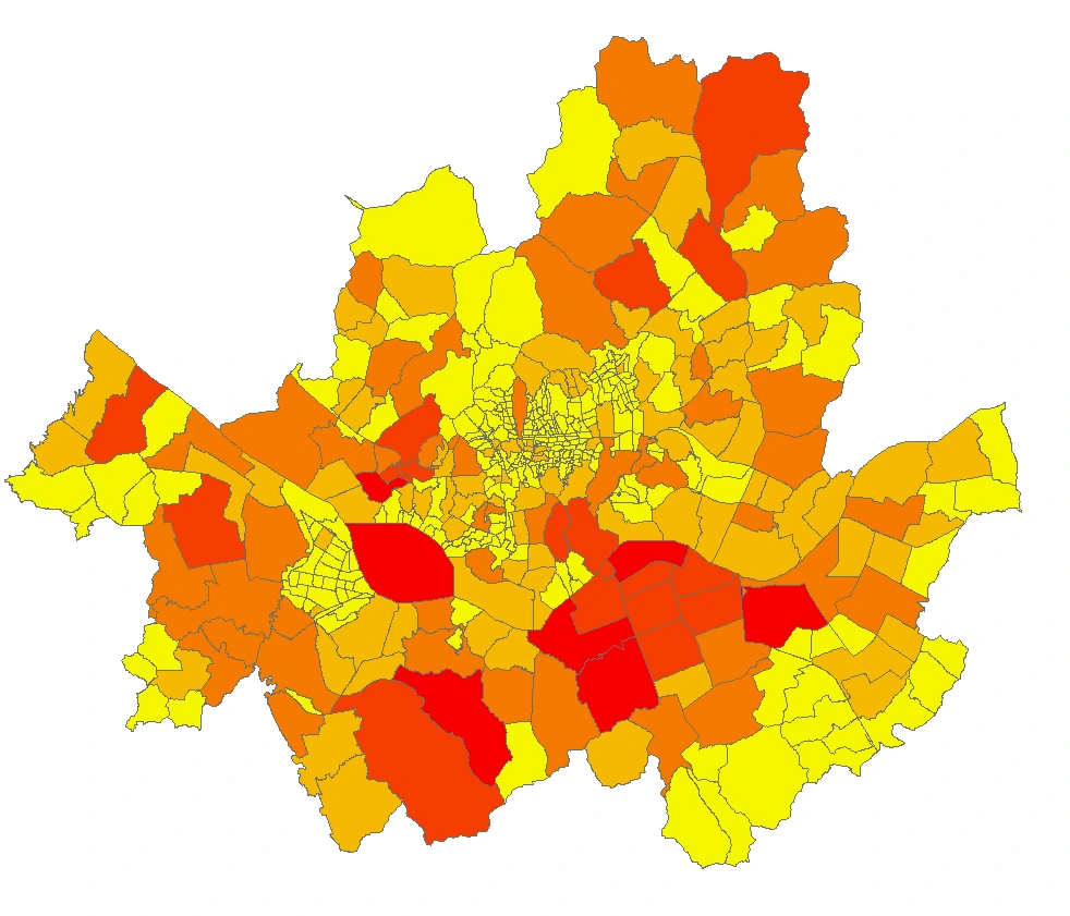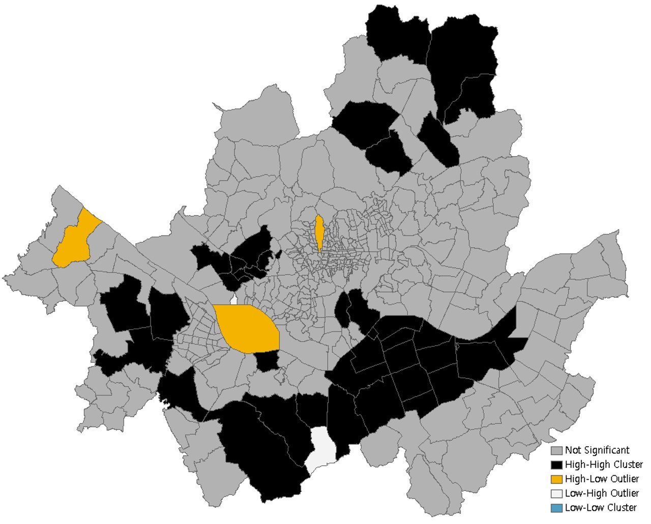 I의 값이 0.384138로 산출되었고, p-value가 0.000000이므로 해당 분포는 99%의 유의확률로 상당히 클러스터되어 있다는 것을 알 수 있다.