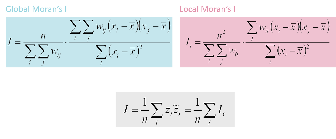 무슨 말인가? global은 전체 공간 단위들의 평균값을 계산하고, local은 각의 공간 단위가 가지고 있는 값들을 각각 개별적으로 계산하기 때문이다. 그래서 local Moran's I의 평균값이 global Moran's I의 값이 된다. 이는 수식을 비교해서 보면 훨씬 이해가 쉽다.