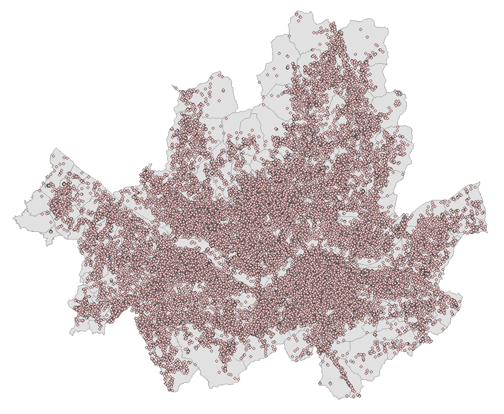 법정동 경계가 거의 안 보일 정도로 많은 양의 포인트들이 서울시를 뒤덮고 있다. 최근에 수집한 데이터와 2년 전에 수집한 데이터를 모두 사용하다 보니 그렇게 되었다.