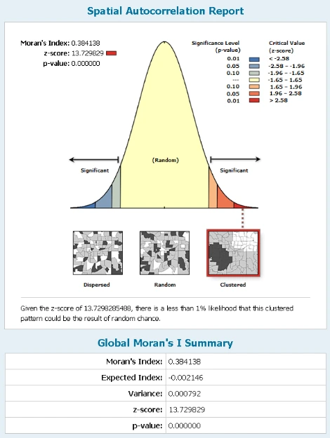 이제 드디어 Moran's I를 돌려 볼 수 있게 되었다. ArcMap 10.2의 내장 툴을 이용하여 Moran's I를 계산한 결과는 아래와 같다.