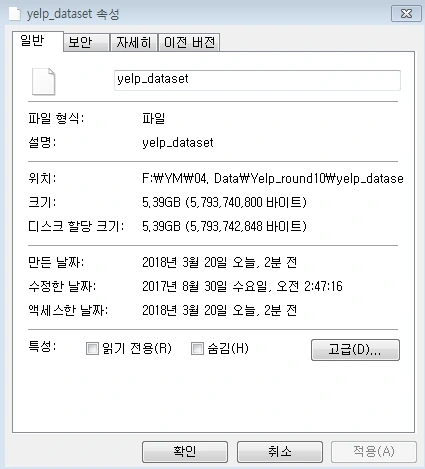 2-2) 그럼 yelp_dataset 폴더에 'yelp_dataset'이라는 파일이 생기는데(그림 1), 이 파일에 확장자명 '.tar'를 붙여준다. 즉, 'yelp_dataset.tar' 이렇게 만든 다음에 한 번 더 압축을 푼다.