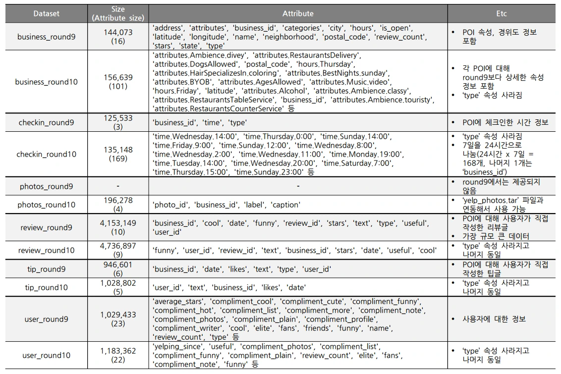 예전에 Yelp dataset challenge 사이트에서 다운로드해 놨던 round 10 데이터를 뜯어보았다(현재는 round 11 제공 중). 전에 논문 쓸 때 round 9 데이터를 사용했었는데, round 10 데이터를 열어 보니 달라진 부분들이 꽤 눈에 띈다(마지막 부분에 정리함).