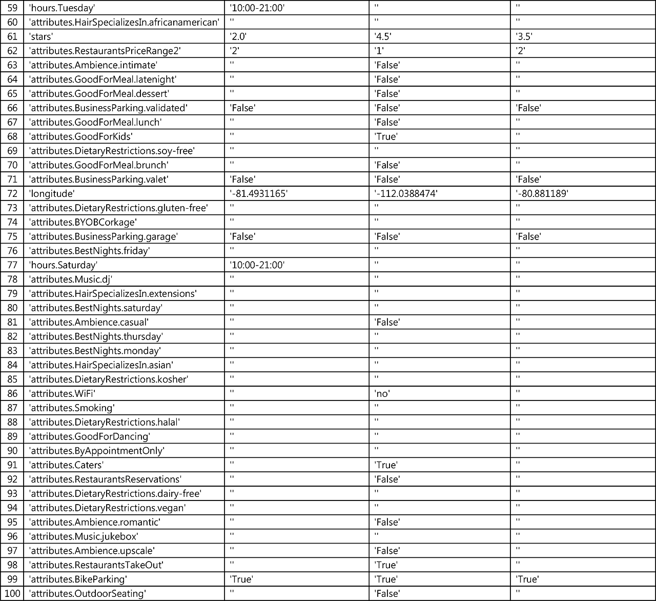 ['attributes.Ambience.divey', 'attributes.RestaurantsDelivery', 'attributes.DogsAllowed', 'postal_code', 'hours.Thursday', 'attributes.HairSpecializesIn.coloring', 'attributes.BestNights.sunday', 'attributes.BYOB', 'attributes.AgesAllowed', 'attributes.Music.video', 'hours.Friday', 'latitude', 'attributes.Alcohol', 'attributes.Ambience.classy', 'attributes.RestaurantsTableService', 'business_id', 'attributes.Ambience.touristy', 'attributes.RestaurantsCounterService', 'attributes.Corkage', 'attributes.RestaurantsGoodForGroups', 'categories', 'name', 'attributes.BusinessAcceptsBitcoin', 'attributes.HappyHour', 'attributes.WheelchairAccessible', 'attributes.Ambience.hipster', 'attributes.BusinessAcceptsCreditCards', 'is_open', 'attributes.DietaryRestrictions.vegetarian', 'attributes.Music.live', 'attributes.Music.background_music', 'neighborhood', 'attributes.BusinessParking.lot', 'attributes.Music.karaoke', 'review_count', 'attributes.GoodForMeal.breakfast', 'attributes.NoiseLevel', 'attributes.HairSpecializesIn.perms', 'state', 'attributes.DriveThru', 'attributes.HasTV', 'attributes.GoodForMeal.dinner', 'attributes.BusinessParking.street', 'address', 'attributes.RestaurantsAttire', 'hours.Sunday', 'attributes.BestNights.tuesday', 'attributes.AcceptsInsurance', 'attributes.BestNights.wednesday', 'hours.Wednesday', 'attributes.HairSpecializesIn.kids', 'attributes.Open24Hours', 'attributes.Ambience.trendy', 'attributes.CoatCheck', 'hours.Monday', 'attributes.HairSpecializesIn.straightperms', 'city', 'attributes.HairSpecializesIn.curly', 'attributes.Music.no_music', 'hours.Tuesday', 'attributes.HairSpecializesIn.africanamerican', 'stars', 'attributes.RestaurantsPriceRange2', 'attributes.Ambience.intimate', 'attributes.GoodForMeal.latenight', 'attributes.GoodForMeal.dessert', 'attributes.BusinessParking.validated', 'attributes.GoodForMeal.lunch', 'attributes.GoodForKids', 'attributes.DietaryRestrictions.soy-free', 'attributes.GoodForMeal.brunch', 'attributes.BusinessParking.valet', 'longitude', 'attributes.DietaryRestrictions.gluten-free', 'attributes.BYOBCorkage', 'attributes.BusinessParking.garage', 'attributes.BestNights.friday', 'hours.Saturday', 'attributes.Music.dj', 'attributes.HairSpecializesIn.extensions', 'attributes.BestNights.saturday', 'attributes.Ambience.casual', 'attributes.BestNights.thursday', 'attributes.BestNights.monday', 'attributes.HairSpecializesIn.asian', 'attributes.DietaryRestrictions.kosher', 'attributes.WiFi', 'attributes.Smoking', 'attributes.DietaryRestrictions.halal', 'attributes.GoodForDancing', 'attributes.ByAppointmentOnly', 'attributes.Caters', 'attributes.RestaurantsReservations', 'attributes.DietaryRestrictions.dairy-free', 'attributes.DietaryRestrictions.vegan', 'attributes.Ambience.romantic', 'attributes.Music.jukebox', 'attributes.Ambience.upscale', 'attributes.RestaurantsTakeOut', 'attributes.BikeParking', 'attributes.OutdoorSeating']