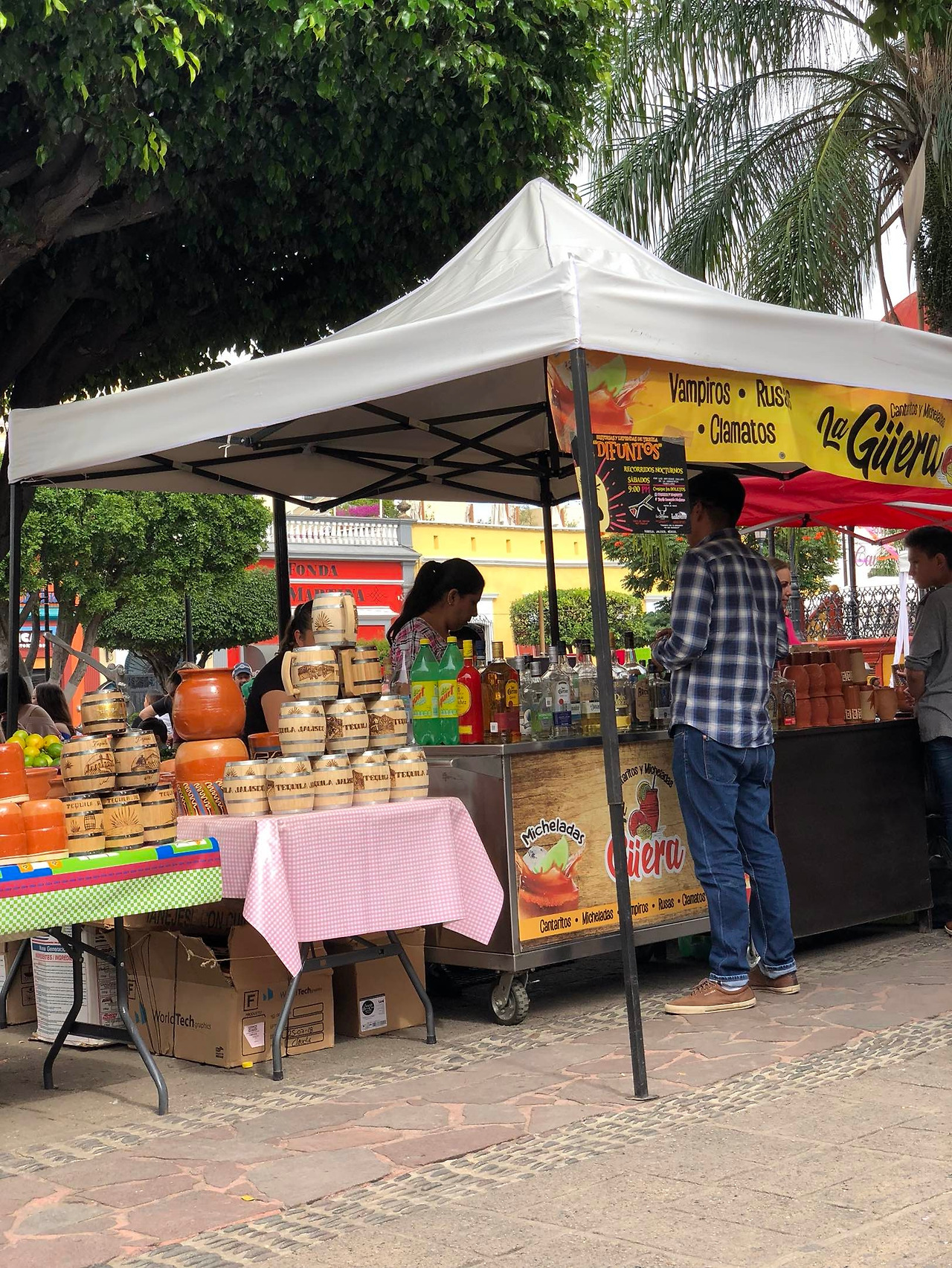 식사를 마치고, 우리는 데낄라 마을을 한 바퀴 돌며 마저 구경을 했다. 데낄라 마을답게 길거리 곳곳에서 술통 모양 컵에 술을 팔고 있었다. 마을 중앙에는 곧 있을 죽은 자의 날을 맞이하기 위한 준비도 한창이다. 데낄라 마을은 전반적으로 한적하고 아기자기한 동네라 걸어 다니며 구경하는 맛이 제법 있다. 비록 데낄라 투어 자체는 다소 실망스러웠지만, 데낄라 마을 구경 자체만으로 꽤 즐거웠다.