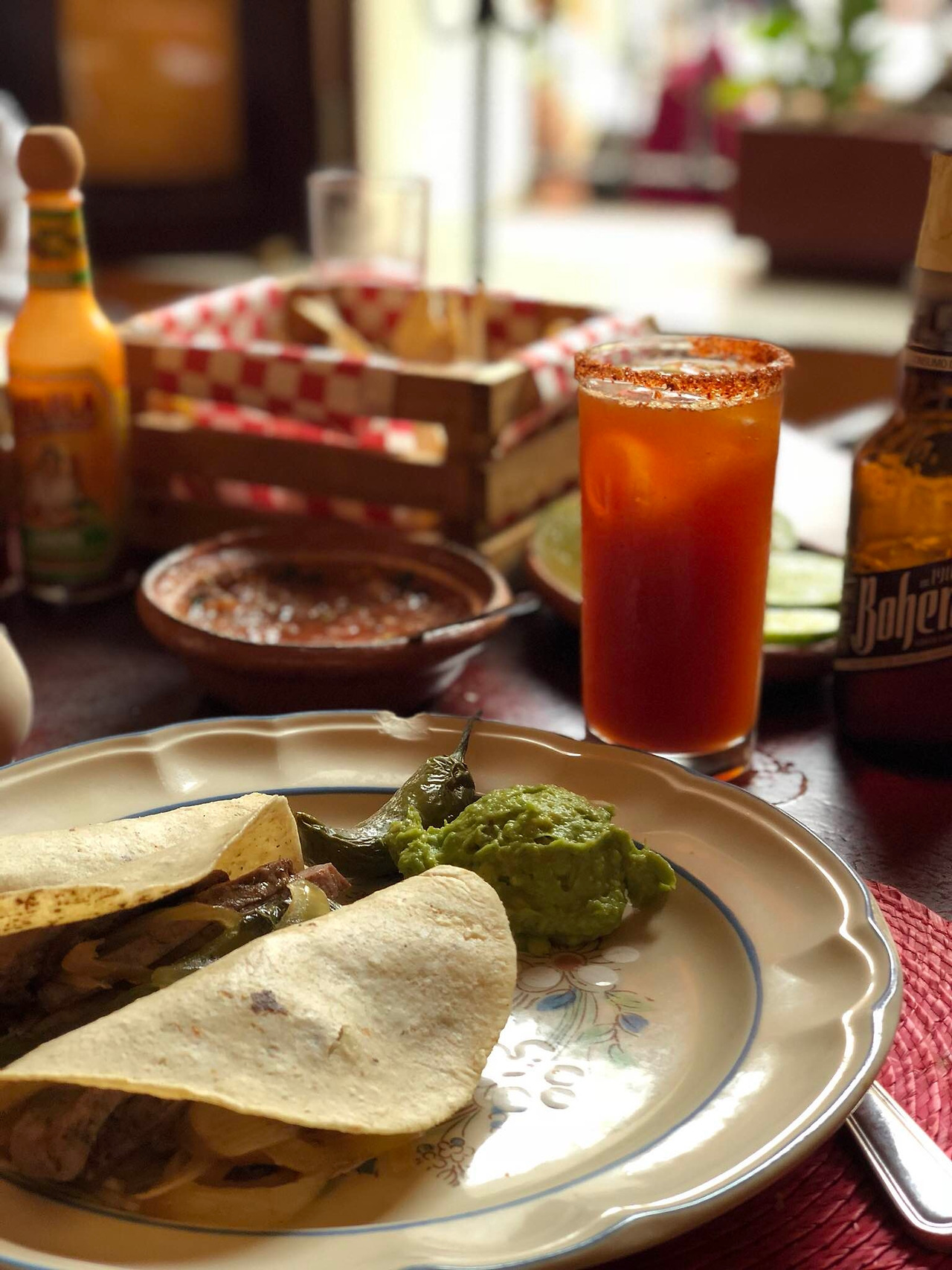 기다림 끝에 드디어 입장. 식탁 위에는 나초, 리몬, 각종 살사들이 준비되어있다. 핫소스 원조 집답게, 핫소스는 3 종류가 제공된다. 나는 미첼라다와 타코를 시켰다. 고기 요리가 유명한 집이라더니, 저렴한 타코 안에도 소고기가 듬뿍 들어 있었다. 가게 분위기 역시 상당했다. 바깥쪽 테라스 좌석은 특히 예뻐; 앉으려는 사람이 많았다. 식당 안으로 끊임없이 마리아치(멕시코 야외 연주 악단)들이 들어와 연주를 했다. 마치아치를 사진을 찍거나, 신청곡을 말하면 돈을 지불해야 한다.