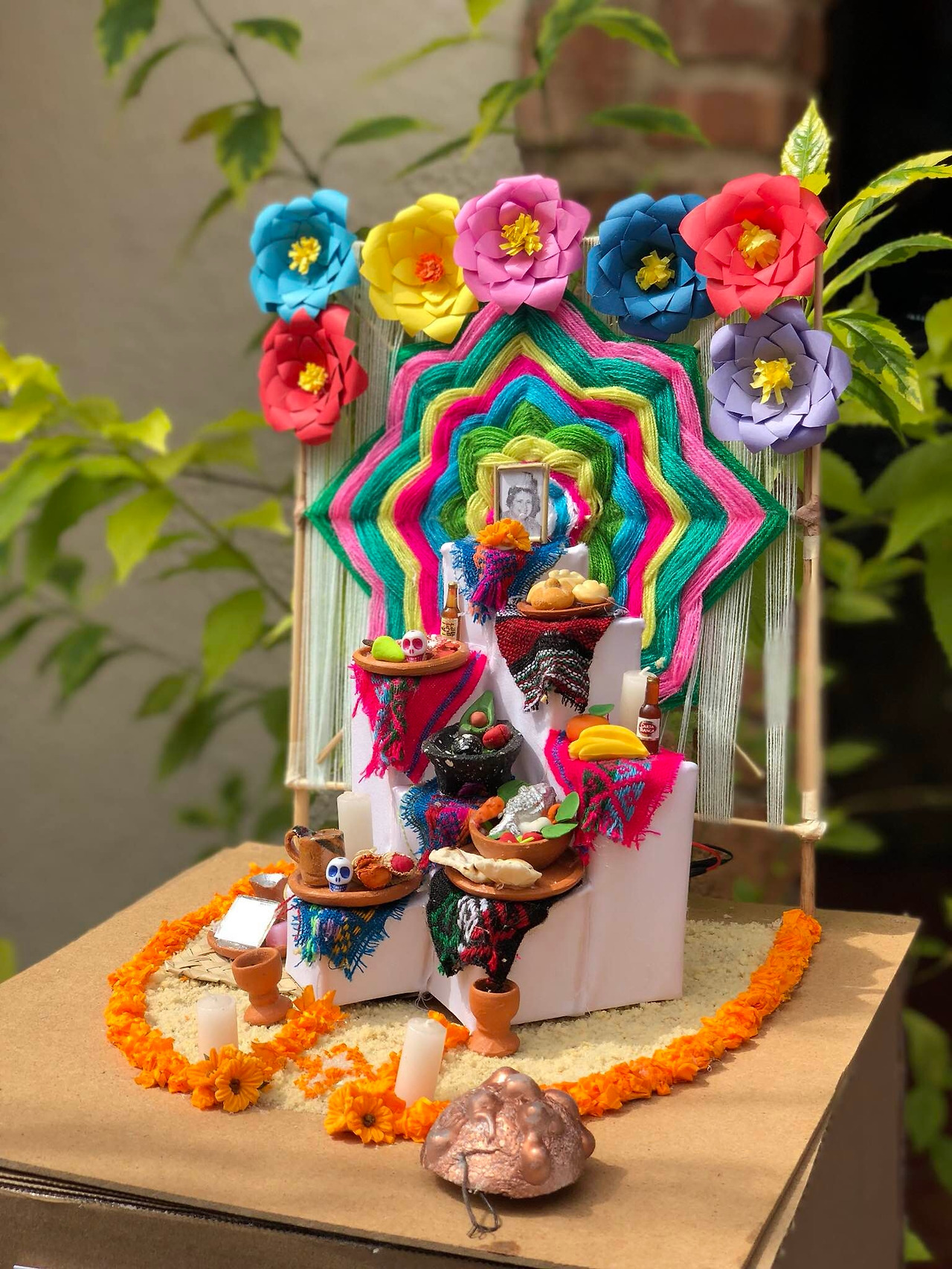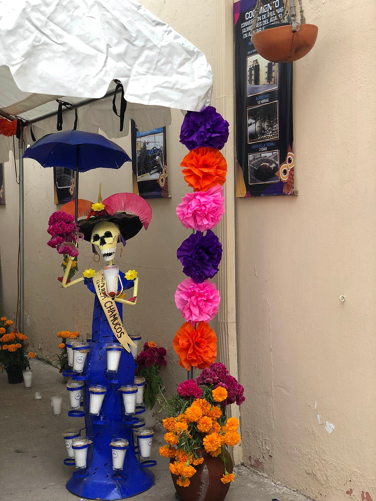 가장 중요한 것은 바로 이 altar 일 것이다. altar는 제단을 뜻하는데, 우리나라의 제사상과 비슷하다. 이 위는 pan de muerto나 죽은 자가 좋아했던 것들과 사진이 올라가고 금잔화로 장식된다. 커다란 재단을 준비할 공간이 없는 카페나 학원 같은 곳은 위와 같은 미니어처 재단을 사서 기분만 내는 것 같다.