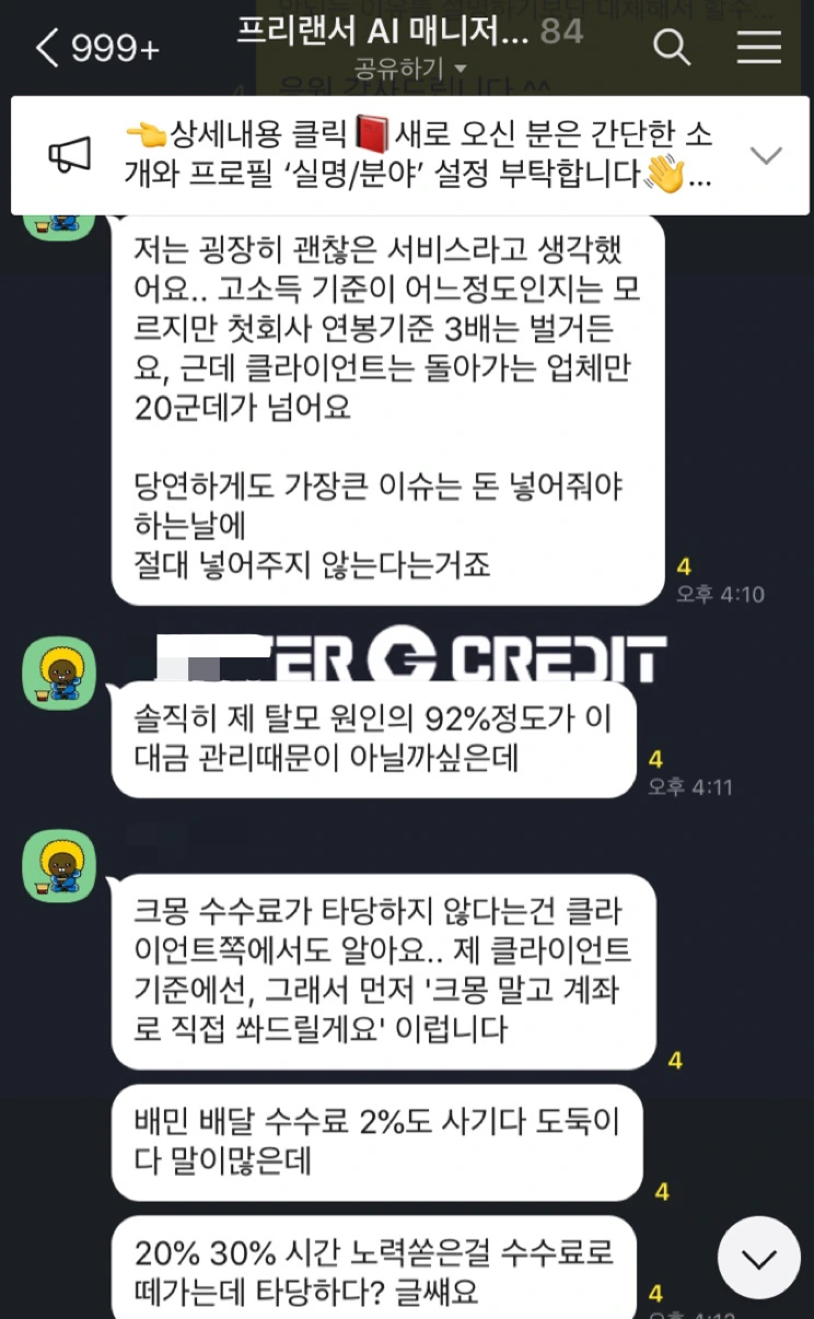 현재 정말 다양한 직업군(프리랜서, 사업가, 변호사, 언론인, 노조, 고용노동부 관계자, 의원실 등)과 의미있는 소통을 하고있습니다. ‘한국 프리랜서 협회’ 운영 취지와 준비중인 사업모델은 매우 간단합니다. 소통을 통해 정부정책이 닿지 않는 프리랜서의 불편함을 공유하고 정책개선를 제안하고 법안을 살피고 법제화를 추진하고 앱 개발을 통해 단계별로 모두에게 유익한 시스템을 만들어갑니다. 이 방엔 어떠한 권위도 존재하지 않고 누구나 목소리를 낼 수 있습니다. 저는 그저 진득한 근성과 진정성으로 사람들을 모을 뿐이지만 집단 지성과 공감대가 할 수 있는 역할은 무한대입니다. 시간은 걸리겠지만 소통 없이 시스템을 악용하여 약자를 갈취하고 이윤만을 추구하는 플랫폼, 기업과는 분명 다른 길을 갈 것입니다.