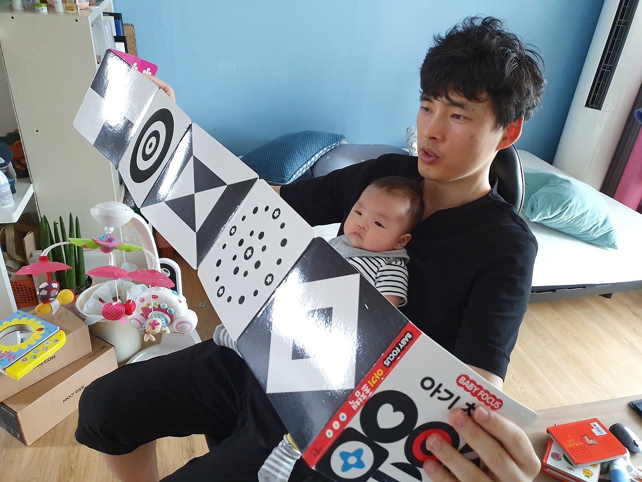 100일 이전의 아기는 계속 누워만 있고 아직 뒤집기도 못 할 시기라 해줘야 할 게 얼마나 있겠나 했던 것은 완전히 착각이었다. 할 수 있는 게 없지만 시간은 보내야 하니 놀아주지 않으면 지루해하고 짜증내고 운다. 움직이지 못하니 큰 사고가 날 일이야 없지만 그렇다고 눈을 뗄 수도 없다. 게다가 나와 아내는 둘 다 육아 쪼렙이라 짠짠이가 울면 멘붕이 와서 견디기 힘들었다. 그나마 나는 무신경한 편이라 버티는데 아내는 우는 소리를 굉장히 괴로워했고 가만히 있을 수가 없었다. 이 글을 쓰는 지금까지도 마찬가지지만, 우리 아들은 심심한 걸 참지 못하는 성격이다. 가만히 누워 계신 아들님에게 쉬지 않고 온갖 콘텐츠를 진상해 올려야 한다.