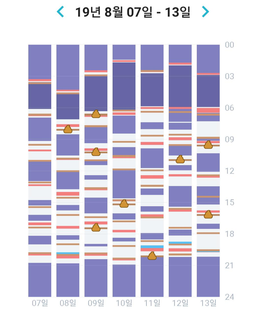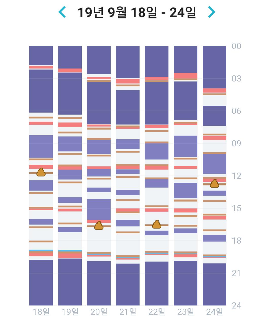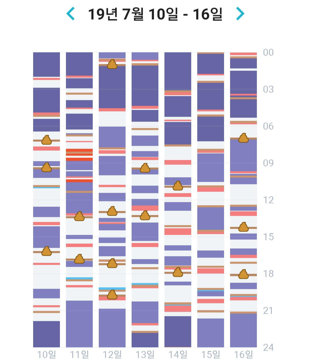 3개월 즈음 어느 날, 아내가 말했다. "패턴 만드는 법을 알 것 같다." 일정한 시간 간격으로 먹고, 놀고, 자는 패턴을 만드는 이른바 '먹놀잠 패턴'. 이 즈음에 수유 텀이 3시간 정도로 잡히기 시작해서 3시간 간격 패턴을 만들기를 시도했다. 수유해서 먹고 나면 1시간 남짓 놀고 졸려할 때 재우는 것. 아내가 짠짠이를 재우는 법을 터득한 덕분에 패턴이 자리를 잡아갔다. 수십 일간 축적된 관찰과 시간 기록 데이터를 토대로 대강 어느 정도 놀고 얼굴 상태가 어떠면 애가 졸린 거구나 하는 걸 알게 되었고, 그때 어두운 침실로 가서 백색소음을 틀고 안고 토닥토닥해주니 잠이 들었다. 만세! 여태까진 애가 언제 자나 하고 기다리기만 했는데 잘 시간이 예측 가능해지고 재우기 스킬을 통해 어느 정도 조절이 가능해지니 시간 관리가 훨씬 수월해졌다.