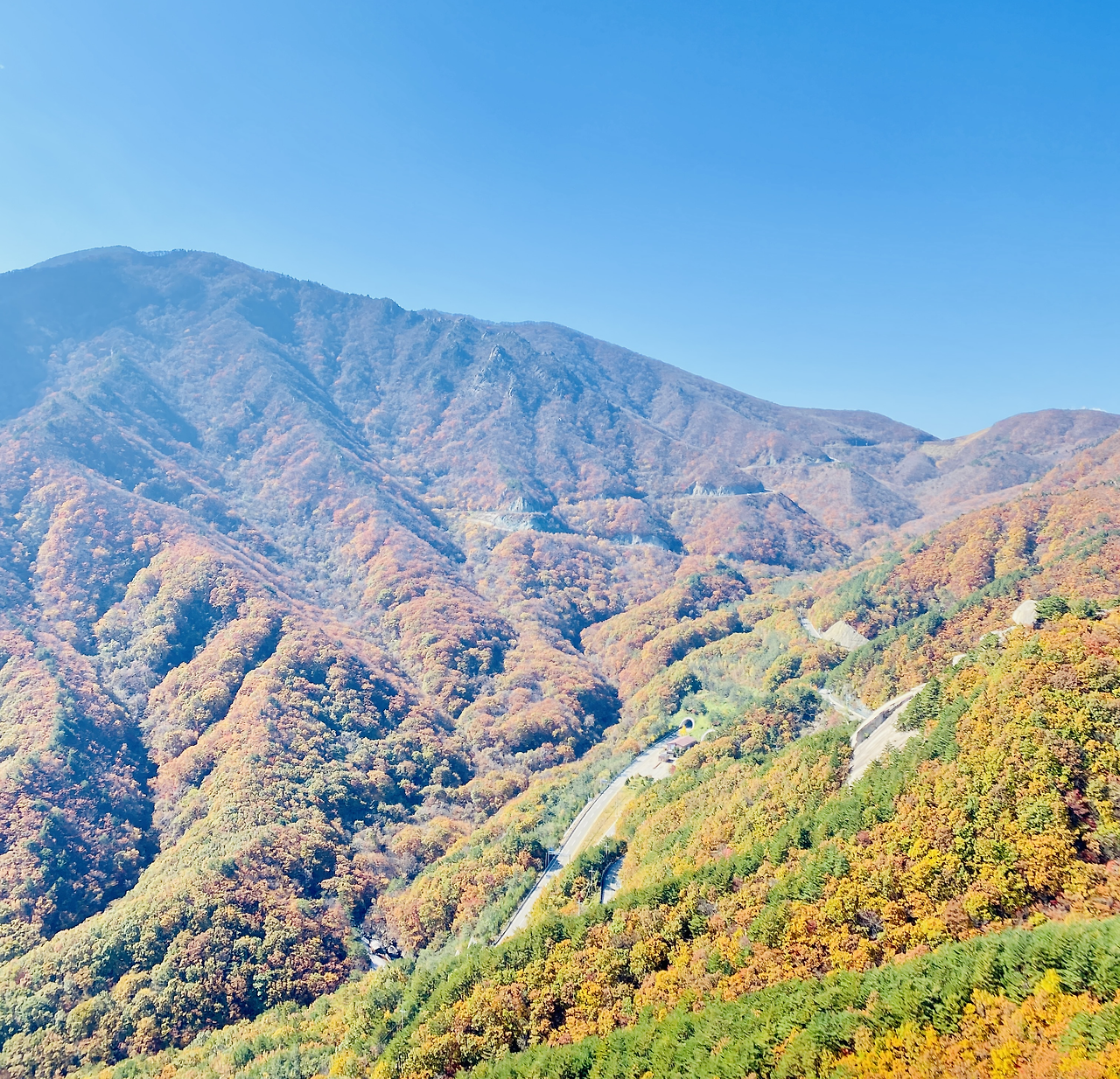 산은 아직 단풍옷을 입고 있었다. 울긋불긋 환하게 빛나고 고왔다. 이렇게 아름답고 찬란한 색으로 뒤덮인 산을 제대로 본 적이 있었던가. 내 인생에서 이처럼 눈부신 가을은 그 어디에도 없었다. 나의 딸도 남편도 자연의 위대한 아름다움에 같이 빠져들었다. (‘아름다움’이란 단어가 단조롭게 들릴 정도로 다 표현하지 못할 세계였다.)