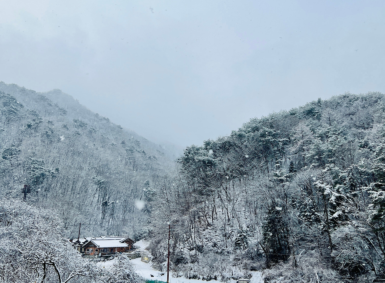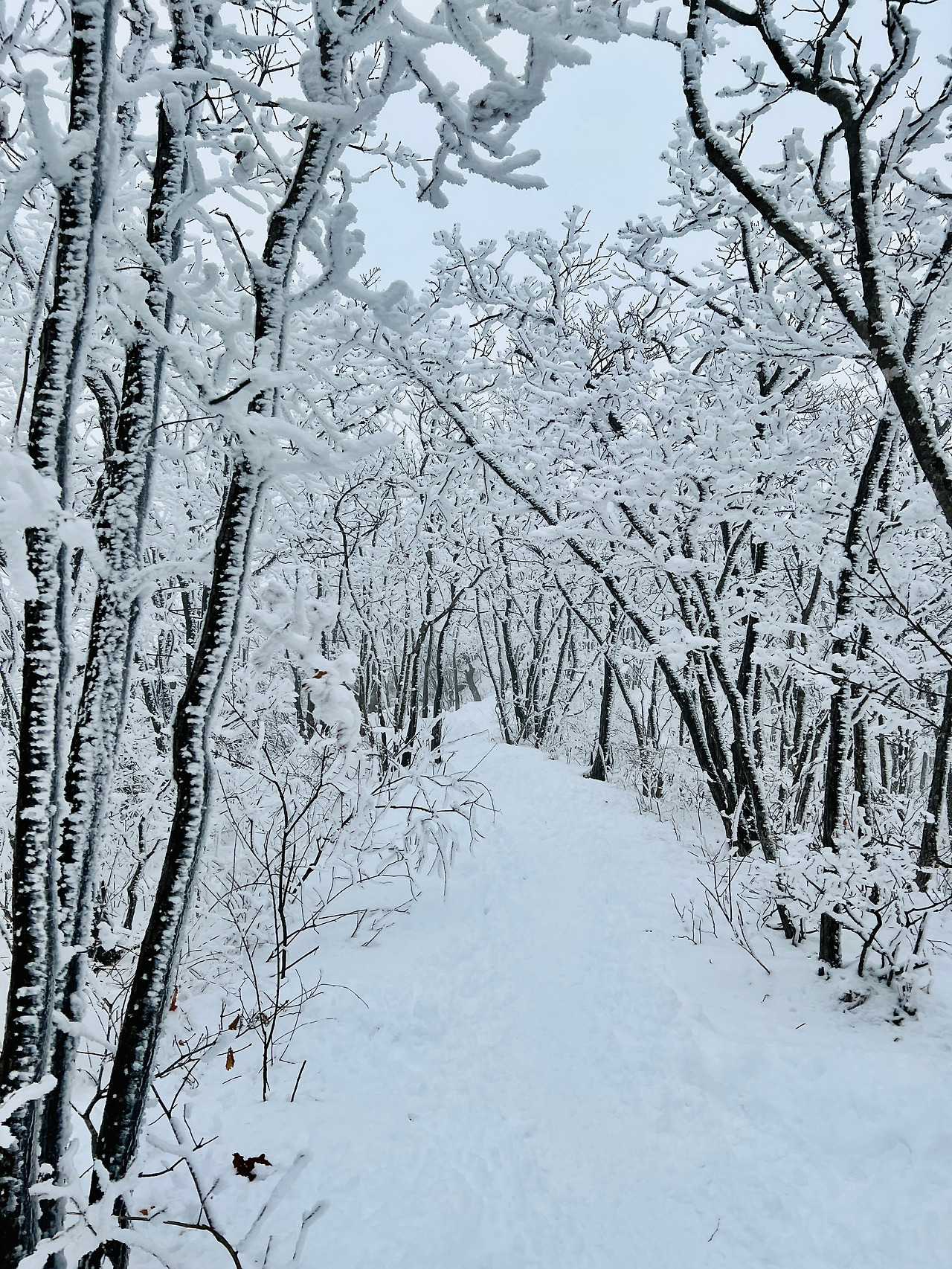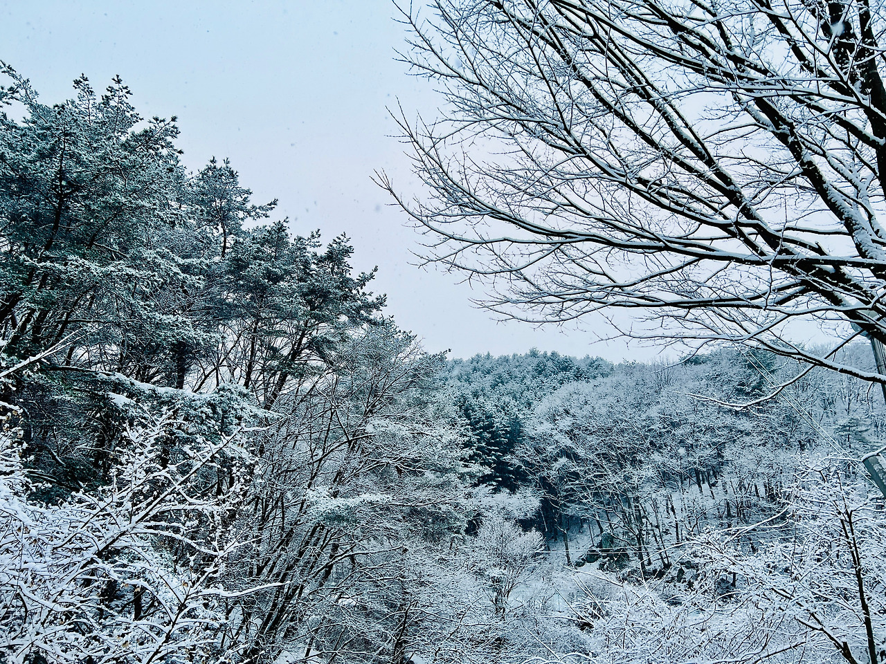 하얀 눈이 쌓인 등산길을 살방살방 내리는 눈을 맞으며 올라갔다. 바람 한 점 없었다. 눈의 담요를 덮은 듯 포근했다. 안개에 둘러싸여 적막하고 고요했다. 이제껏 보지 못한 종류의 아름다움이었다.