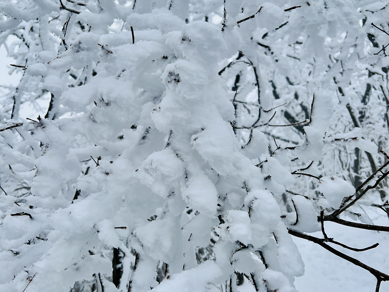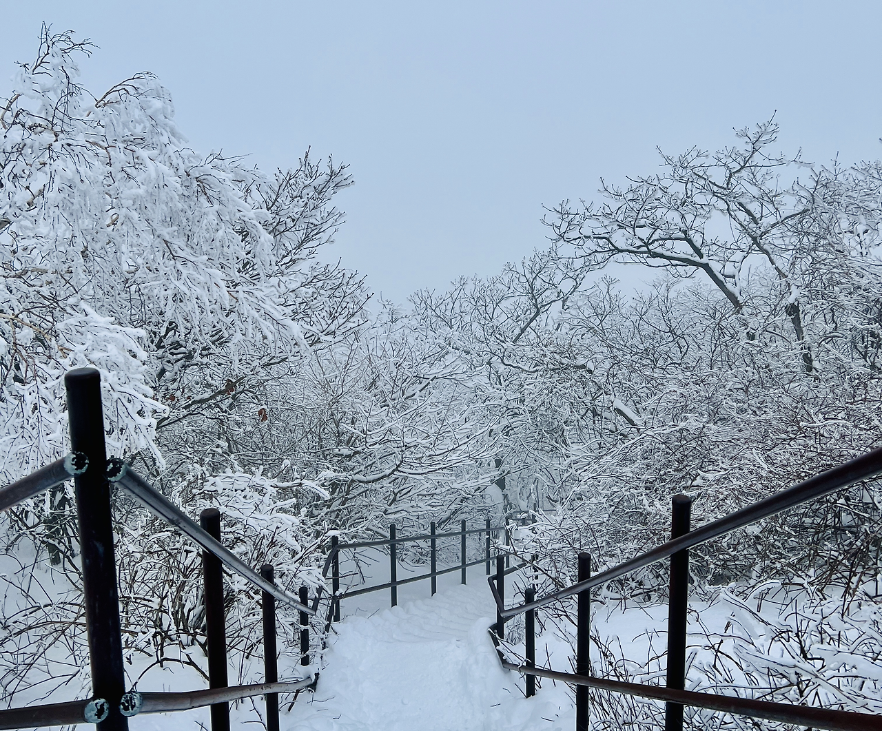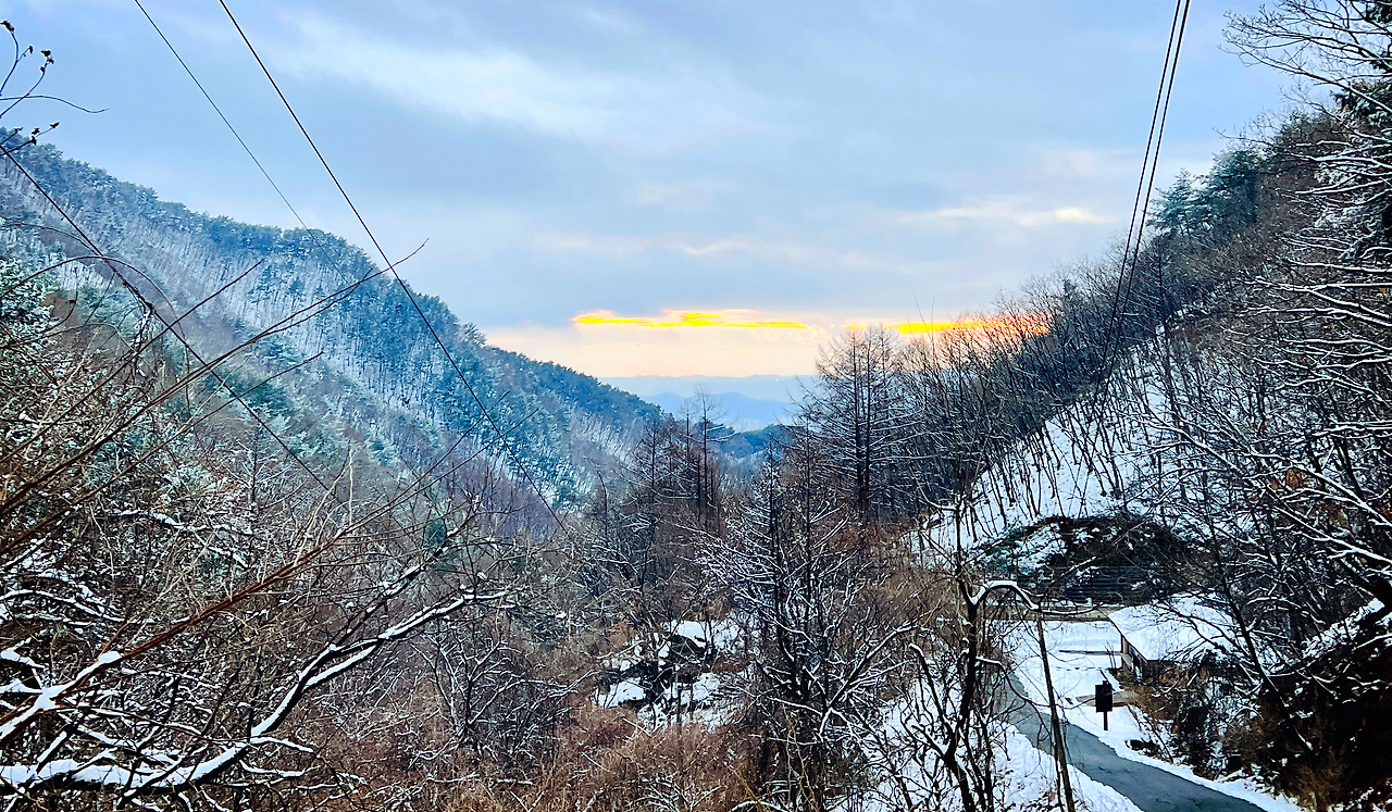 하얀 눈이 쌓인 등산길을 살방살방 내리는 눈을 맞으며 올라갔다. 바람 한 점 없었다. 눈의 담요를 덮은 듯 포근했다. 안개에 둘러싸여 적막하고 고요했다. 이제껏 보지 못한 종류의 아름다움이었다.
